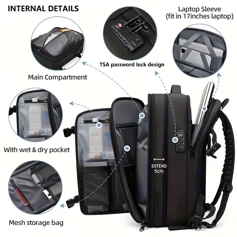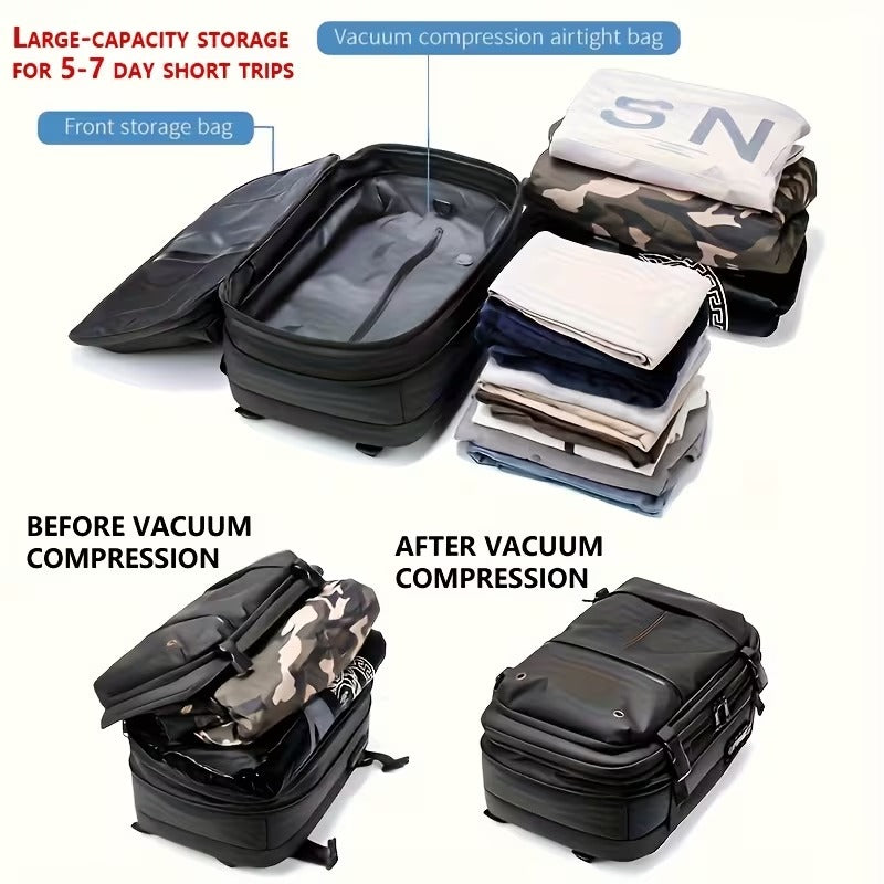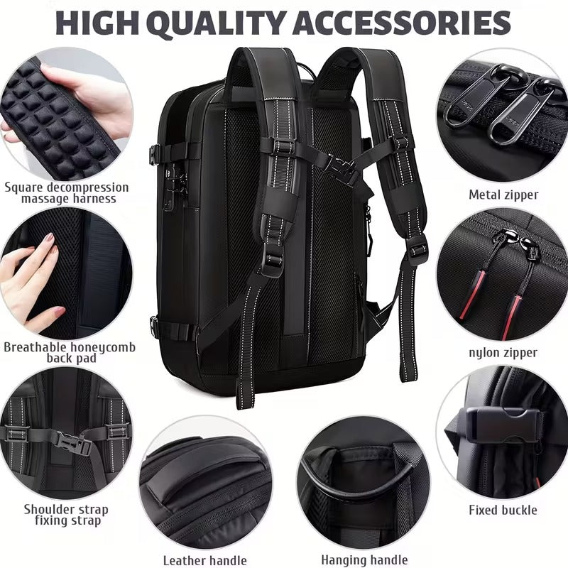 The NNETM TSA Vacuum Compression Travel Laptop Backpack is designed for efficient, organized travel. Its expandable and collapsible compartments allow you to maximize space while keeping your 15.6" laptop protected. Made from durable nylon and polyester fiber, this backpack combines lightweight functionality with TSA compliance for worry-free airplane carry-on use.