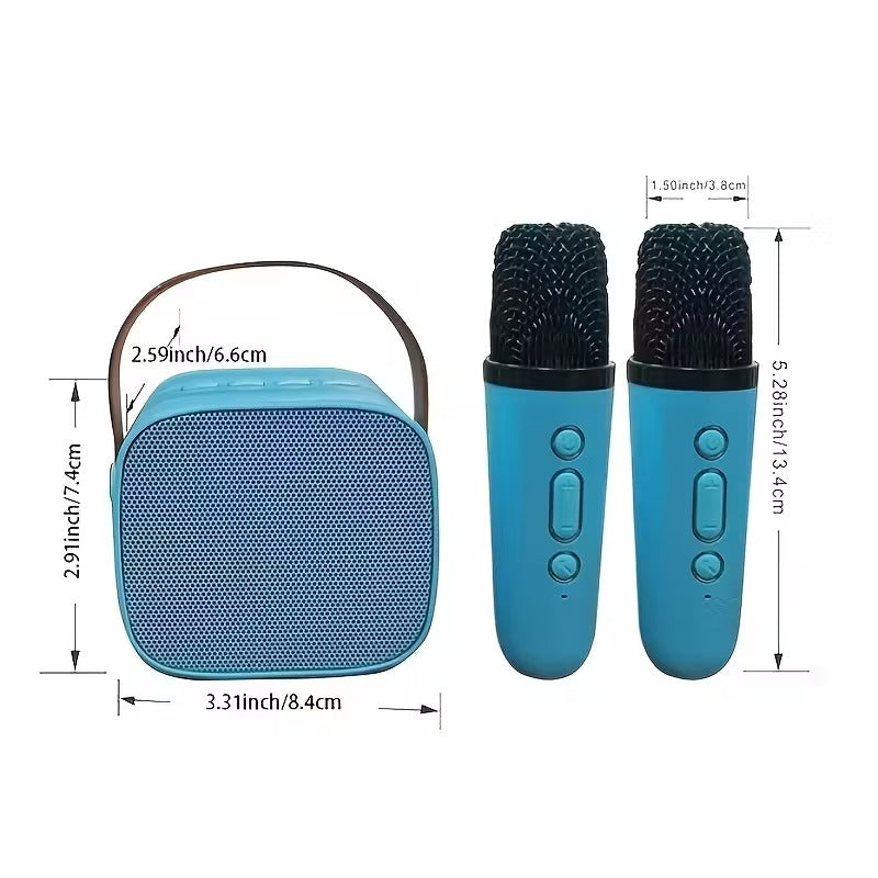 The NNETM Mini Portable Karaoke Speaker comes with 2 microphones, making it perfect for home parties, outdoor gatherings, and holiday celebrations. Its rechargeable Lithium Battery-18650 series allows hours of entertainment without interruptions. Dimensions can be seen in the image for accurate size reference. With wireless functionality and Type-C charging, this portable speaker combines convenience and fun in a compact design.