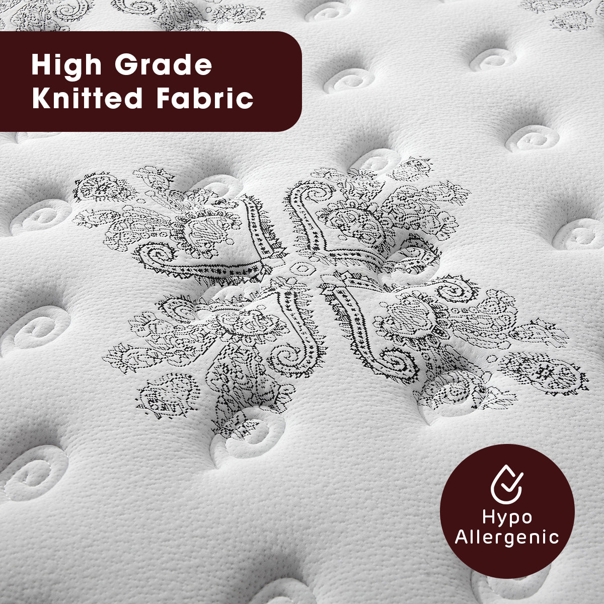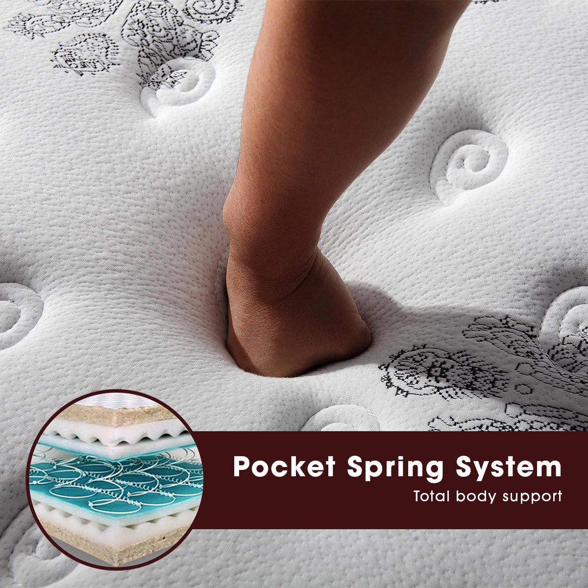 Pocket Springs follow the natural contours of your body for sublime comfort, reduces deformation and responds precisely to your every movement. Specifically zoned in 5 places to provide maximum support. It offers edge to edge support resulting in a larger sleep surface and ensuring this top quality mattress has a long life span.