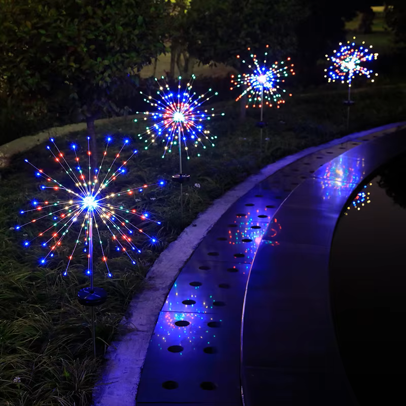 Illuminate your garden with vibrant solar fireworks lights featuring 8 dazzling modes.