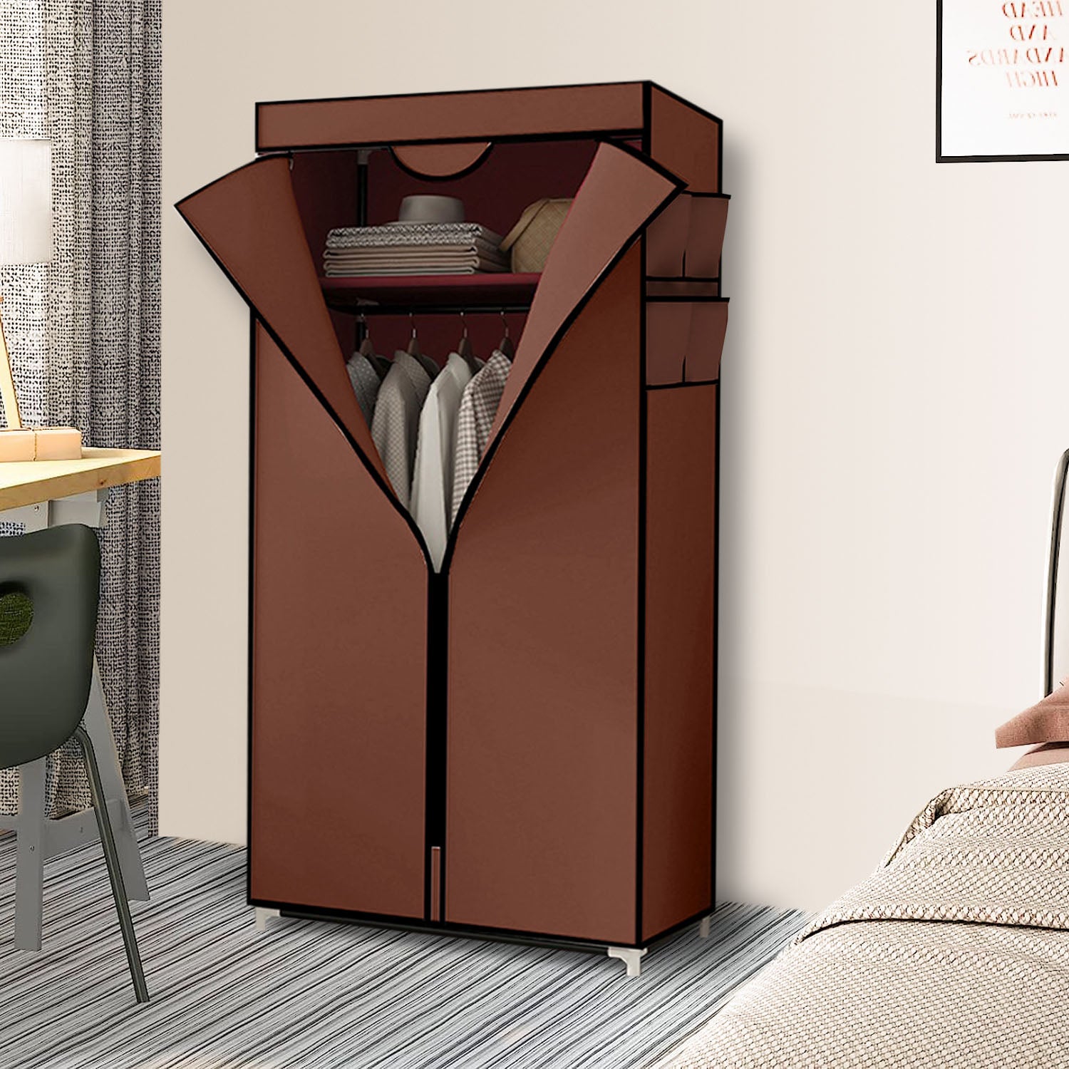 - Introducing the Brown Clothes Organizer Rack with Zippered Dust Cover the perfect solution for keeping your clothing organized and protected from dust.