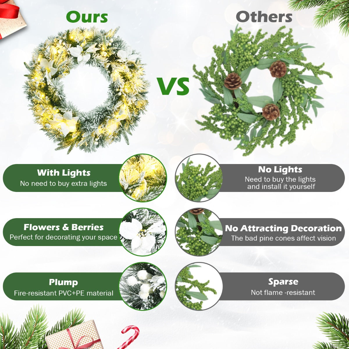 This beautiful pre-lit wreath is great to decorate the home and create a warming holiday atmosphere. It is worth mentioning that the wreath is made of 100% new PVC & PE material, superior to the recycled material in color and texture, which is also odorless for safe home use. You can hang it on and welcome the happy holiday to come with your family and friends since it is decorated with a lot of flowers, berries, and bright LED lights that sure to add joy to Christmas. If you are looking for a wreath that is highly visible from the street and is sure to bring many compliments from your neighbors, this wreath is perfect for you! Bullet Point:Rich Ornaments for Eye-Catching Look: With snow-white berries and vivid poinsettia as decoration, this full-bodied Christmas wreath is as charming as the real thing and all together contributing to a romantic wintry feeling. The beautiful combination of snow-flocked branches & delicate ornaments is sure to provide eye-catching looking and impress you as well. Lush and Realistic Appearance: 114 individually crafted branch tips are tightly clustered together to form the lush Christmas wreath in front of you. The white artificial snow correctly covers the tip of each branch to make it look more realistic and truly restore the visual experience of pine branches in the natural environment. High-Quality PVC & PE Material: The holiday wreath is made of 100% new PVC & PE material rather than recycled material, providing a better using experience since high-quality new material has excellent fade resistance and odor-free character. It is surely a family-friendly as well as safety decoration in your house. Warm LED Lights with Timing Function: The Christmas wreath is equipped with 50 premium LED lights, which emit soft and comfortable lighting to fill the room with a warm and happy atmosphere. Moreover, the 6-hour on / 18-hour off timer function & battery-powered design (3AA not included) leave you no worries of complicated assembly or operation. No Required Assembly & Convenient Storage: No need for assembly, you are capable of hanging the wreath as soon as you take the package since it is fully assembled. Besides it is an ideal choice to decorate homes, schools, offices, and holiday activities. Features: Decorations such as flowers, berries and lights for an eye-catching look 114 realistic branch tips are tightly clustered together, more lush and natural Classic flocked appearance creates a wonderful Christmas party 100% New high-quality PVC and PE material, odorless, ultra-durable Warm lighting is powered by batteries with 6H On/18 H Off timer function No assembly required, save you time and energy Ideal for homes, schools, offices, and holiday activities, etc Specification: Color: White Material: New PVC+ New PE Diameter: 60cm Net weight: 1 kg Number of tips: 114 Number of lights: 50 Battery powered:3 xAA (not included) Package Includes: 1 x Pre-lit Snow Flocked Christmas Wreath Box Qty:1(May vary by batch)