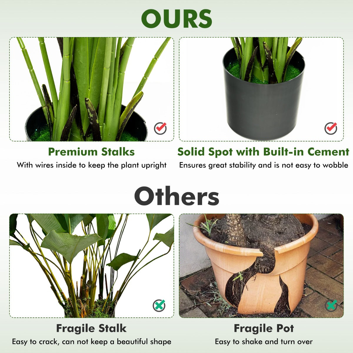 Our 1.5M artificial monstera deliciosa plant comes with 15 large leaves and 15 sturdy trunks, helping create a dense and full appearance. No matter for a corner or the front porch, it can be a highlight of your living space. Besides, the leaves are made of high-quality PEVA material, which is not easy to fade or break and keeps vibrant and green all year round. More than that, in contrast to real plants, our faux tree does not need to water, trim, fertilize, or absorb sunlight, and it also would not be affected by the nature climate. And the solid cement pot helps prevent kids or pets from knocking it down easily. And it is easy to assemble, just insert 15 leaves one by one and flare out leaves for a more natural look. Bullet Point:Vivid and Verdant Appearance: Leaves of the artificial tree imitate real monstera deliciosa leaves, providing realistic texture and touch. Moreover, they are made of premium PEVA leaves, which are not only non-odor and non-allergic for ensuring safe use but also durable and not easy to break, ensuring a long lifespan. Perfect Decoration: The 1.5M artificial plant is designed with 15-piece large and wide leaves in 4 different sizes and color variations, bringing nature and elegance to your living space. It can be a perfect addition to your home, office, store, patio, terrace, entryway, and more. Easy Maintenance and Keep Evergreen: The fake tree requires no watering, sunlight, trimming, or fertilizer, which can effectively saves your time and energy to take care of plants while staying evergreen and vibrancy throughout the seasons. And the leaves would not fade or wither. In addition, it is easy to maintain with a wet cloth. Sturdy and Stable Structure: The faux tree is equipped with a sturdy cement pot, ensuring the overall stability of the standing tree. And there exist 15 durable trunks that would not easy to break or deform. In addition, we suggest placing it in a bigger decorative planter, making it more elegant. Easy Assembly and DIY Design: The trunks are installed already and the leaves are required for assembly. You can insert the 15 leaves in the order of the instructions, or you can DIY the shape to create a unique decorative tree. Besides, please carefully bend stems outward to give the tree a fluffy shape. Specifications:Colour: Green, BlackMaterial: PEVA, Plastic, Wire, CementHeight: 152.5 cmPot Size: 19.5 x 17.5 cmNumber of Leaves: 15Net Weight of: 8.5 kgBox QTY: 1(May vary by batch) Package Included: 1x Artificial Tree1 x User's Manual
