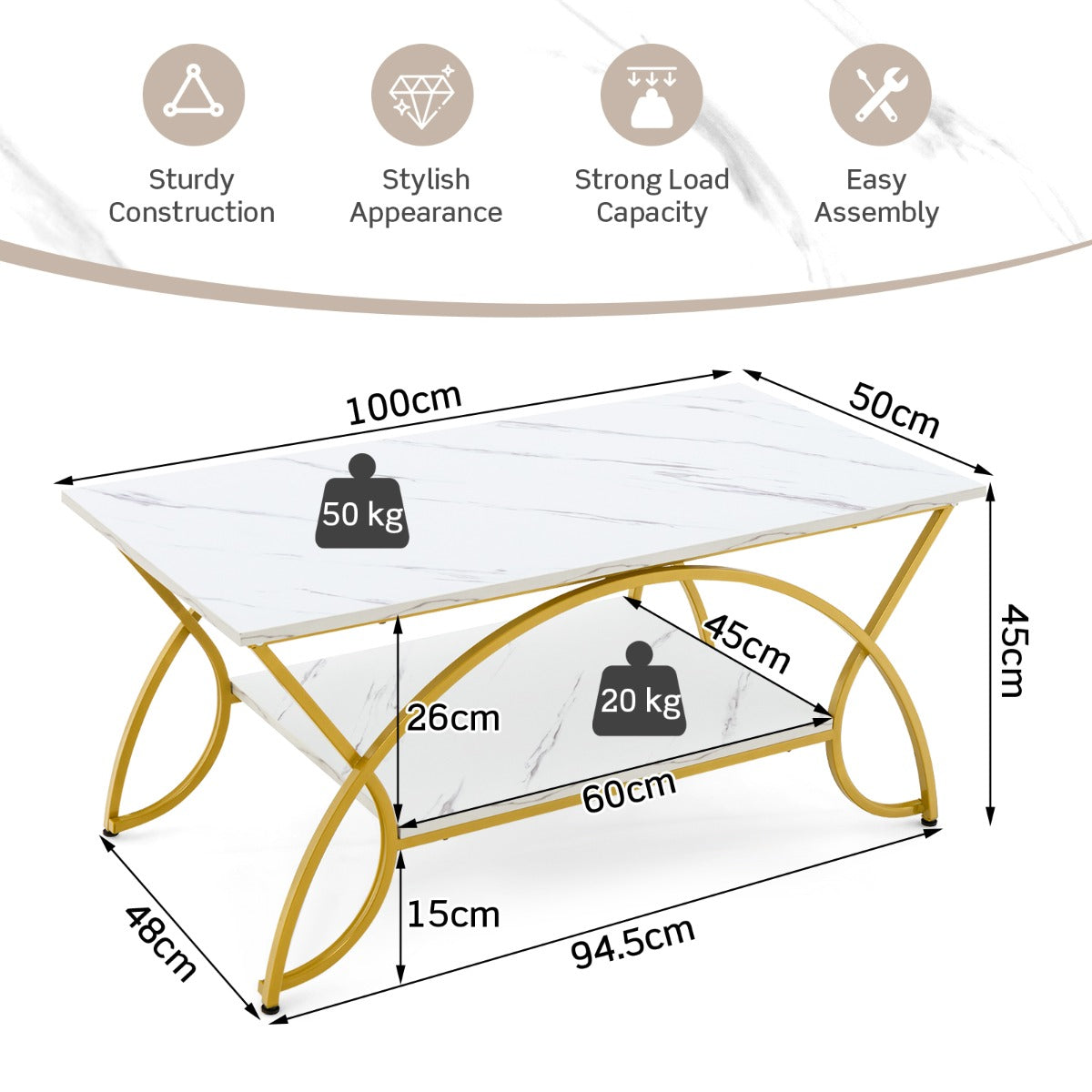 Featuring a white faux marble tabletop and sleek, exquisite gold metal legs, this modern coffee table is both durable and stylish, and will go with any home style. Besides, the sleek, curved clean lines of the supporting frame not only look exquisitely beautiful but also add stability. Meanwhile, the 2-tier coffee table with storage is also a functional addition to your living room. You can use it to hold your favourite vases and decorations, store sundries, or serve afternoon tea during your leisure time.
