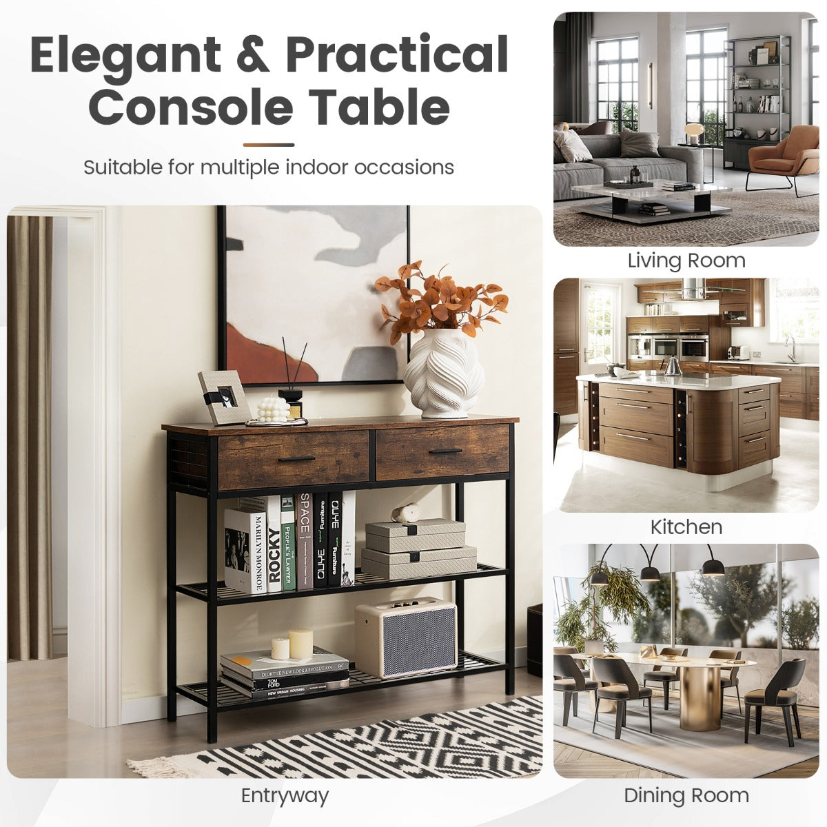 NNECW 100cm Console Table with 2 Drawers & 2-Tier Shelves & Anti-Toppling Design-Brown