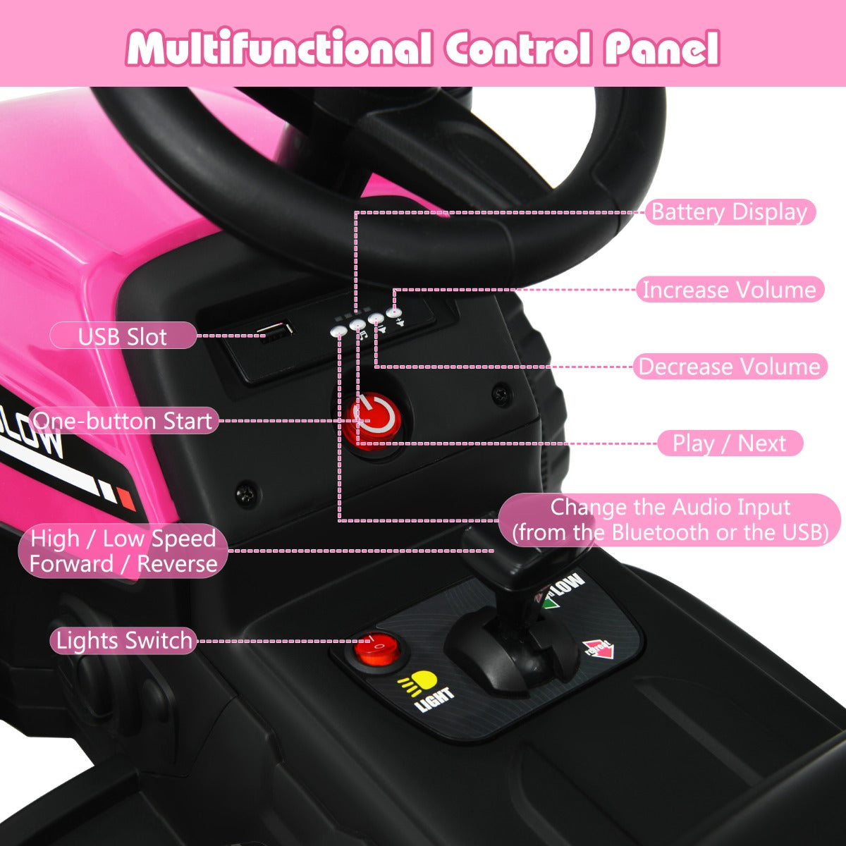 This kid's ride-on tractor is a perfect gift for kids over 3. Realistic tractor outlook, bright LED lights, a simulated chimney and beautiful stickers will attract kid's attention at first sight. Our tractor has a detachable trailer, so kids can easily remove the trailer to use it as an ordinary ride-on vehicle. Kids can manually control the vehicle with the steering wheel, buttons and 3-gear lever. Besides, parents can also adjust its speed and direction with our remote control (requires 2 AAA batteries, not included). Slow-start system and 6 non-slip wheels ensure safe and smooth driving. Kids can drive it at 3-8 km/h speed on brick road, wood floor, cement road and plastic track. What's more, the control panel has wireless and USB input and indicator lights. And horn on the steering wheel also offers more fun. Made of high-quality PP and iron, our tractor can serve your kids for a long time and support up to 30 kg. Bullet Point: Realistic Kids Tractor with Trailer: This kid's ride-on tractor is an ideal gift for kids over 3. It has a realistic tractor outlook, bright headlights and attractive colors. Kids can use the detachable trailer to carry straws, flowers and various garden supplies for more fun. Kids can pretend to be a farmer. And if needed, you can remove the trailer by detaching the screw of the connection part. Safe and Smooth Driving Experience: Slow start system avoids sudden acceleration or braking. With 6 non-slip and wear-resistant wheels, kids can safely and steadily drive on various flat roads, such as brick road, wood floor, cement road and plastic track. In addition, our PP-made seat can bear a weight up to 66 lbs. The seat also has a backrest, safety belt and handrails to offer your little one's all-around protection. 3-Gear System and Remote Control Mode: Our tractor is designed with 2 operation modes: manual control mode and remote control mode. Kids can easily control this car with 3-gear lever, start button, steering wheel and foot pedal. And parents can also operate it with 2.4G remote control(requires 2 AAA batteries, not included), which is great for parent-child interaction. Built-in Battery and Premium Materials: Thanks to the 12V 7A rechargeable battery, our tractor ensures a speed of 3-8 km/h, providing kids with a cheerful driving experience. Its charging time is 8-12 hours. Made of premium PP and iron materials, this toy car ensures excellent stability and high durability. Intuitive Control Panel for More Fun: With wireless and USB input, our vehicle plays music to bring kids much more fun. Kids can press the buttons on the control panel to adjust the music volume and play the music. Kids can hear the horn by pressing the button of our steering wheel. And indicator lights will display the power level of the built-in battery. Features: Realistic tractor look, bright LED lights, simulated chimney add more fun Includes a detachable trailer to store toys, snacks, flowers, garden supplies, etc 12V 7A rechargeable battery for long driving time Soft start technology and 6 non-slip wheels for safe driving Wide seat with backrest, safety belt and handrails ensures kid's safety Perfect for wood floor, plastic track, cement road, brick road, etc Contains 2 operation modes: parental remote control mode and manual control mode 3-gear system, start button, steering wheel and foot pedal for manual operation Wireless and USB input for music playing Steering wheel with horn for more joy Able to hold a weight up to 30 kg Premium PP and iron materials for durability and stability Specifications: Colour: Black/Pink/Red/Green/Dark Green Material: PP + Iron Product Dimensions:135 x 51 x 53 cm (L x W x H) Net Weight:12.93 kg Load Capacity: 30 kg Charger: 12V 1000mA Battery: 12V 7AH Remote Control Battery: 2 AAA 1.5 V batteries(not included) Speed: 3-8 km/h Suitable Age: 3+ Years Charge Time: 8-12 hours Package includes: 1 x Kids Ride On Tractor 1 x Remote Control 1 x Charger 1 x Instruction Box Qty:1(May vary by batch)