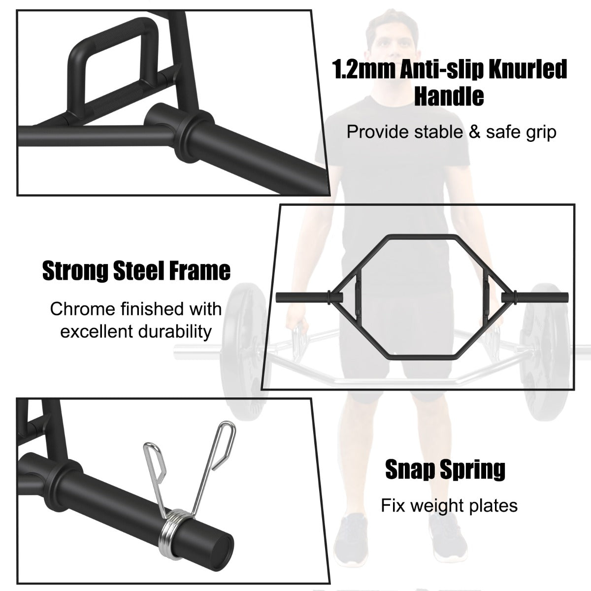If you’re in the market for fitness equipment that is suitable for many different types of fitness activities, like powerlifting, push-ups and presses, then this is for you. Made of heavy-duty steel with phosphorizing finishing, our Olympic hex bar is rust and wear-resistant. You are free to add weight plates to the loadable sleeve, as long as the thickness and the weight of the plates do not exceed the limit of the bar. The whole product has a maximum bearing capacity of 365kg. Except for that, 2 snap springs, included in the package, help you fix and lock the weight plates tightly. 2 different grip positions, and both are knurled to increase friction and meet your different fitness needs. It is worth mentioning that the grip can be folded. Bullet Point: Ultimate Tool For Heavy Lifters: Due to its ergonomic design, the weight is evenly distributed through the middle line of your body, which effectively reduces the stress on your back and avoids the risk of injury. Moreover, it can be used to perform deadlifts, shoulder presses, bench presses, and push-ups for whole-body workouts. Heavy-duty Steel Construction: The Olympic trap bar is crafted with premium steel material(not hollow), tough enough to hold up to 365 kg. With sturdy construction, it’s hard to deform during training, which also ensures durable and long-lasting use. Besides, the phosphating surface makes it hard to rust and stain. Two Positions for Weight Lifting: Two different grip positions are available for weight lifting and bodybuilding. The bar offers two grip handles to suit your desired exercise regimen, which also allows you to perform different workouts that ensure the most muscle engagement. 25.5 cm Long Loadable Sleeves and 2 Snap Springs: Featuring two 25.5 cm long sleeves, the Olympic trap bar allows for a free combination of weight plates. 2 high-quality snap springs ensure safety in use. Both bars have a 5 cm load diameter to ensure bars fit all standard 5 cm plates. Foldable Handles with Knurled Design: With 2 self-closing handles, the bar can be conveniently stored under a bed or sofa when not in use. Additionally, both handles come with a knurled design for a better grip and more friction, to avoid sports injury caused by slipping. Features: Wide range of applications, deadlifts, push-ups, floor presses and shoulder press Made of heavy-duty steel construction with chrome finishing, durable and beautiful 2 grip options, regular and raised handles give you more flexibility Dual knurled handles for increased friction and the handles can be folded Easy to load or unload the weight plate, 2 snap springs to fix weight plates Great Olympic hex bar addition for home or commercial gyms Maximum bearing weight of 365kg, the loadable sleeve measures 25.5cm Specifications: Material: Steel Overall Length: 142 cm Length of Loadable Sleeve: 25.5 cm Net Weight: 18 kg Maximum Weight Capacity: 365 kg Package Includes: 1 x Olympic Hex Bar 2 x Snap Spring Box Qty:1(May vary by batch)
