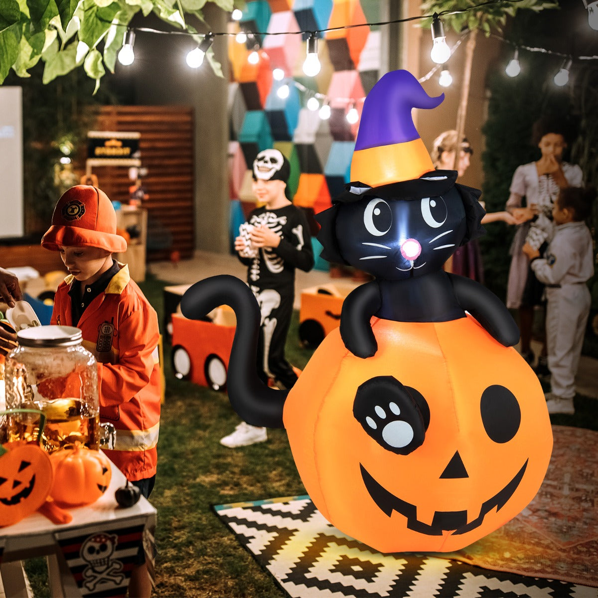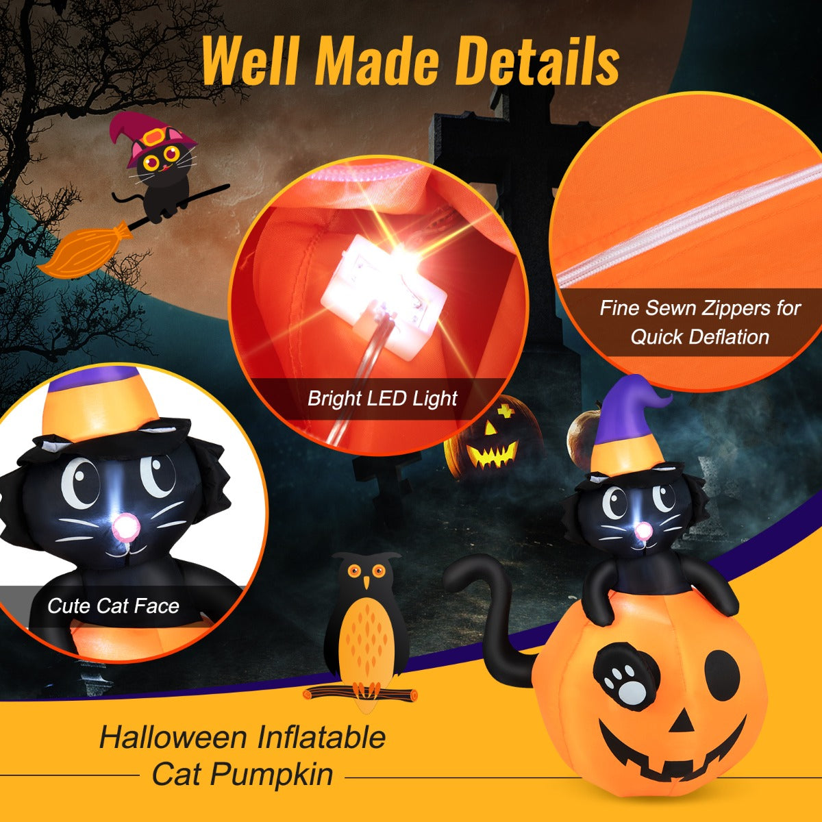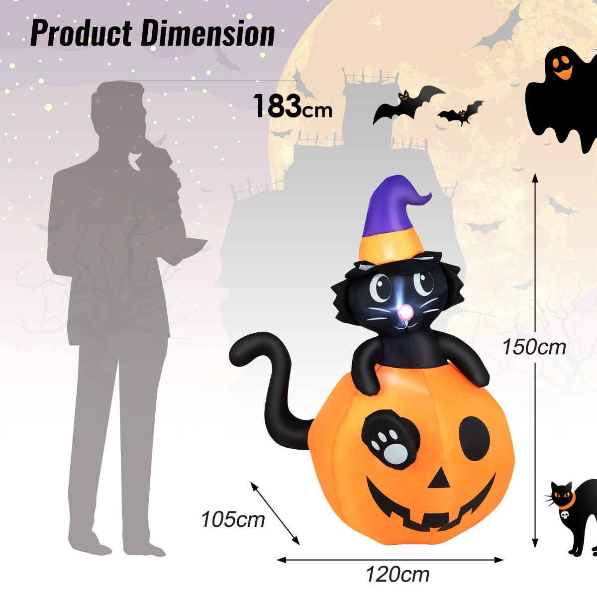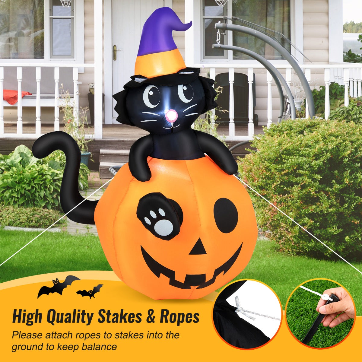 Attractive Lighted Decoration: With a funny appearance of a black cat stuck in a pumpkin, the Halloween inflatable decoration will attract the kids' eyes and remind them of the Halloween spirit. Besides, it has 2 built-in LED lights that will light up the cat and the pumpkin at night and make for the perfect display.