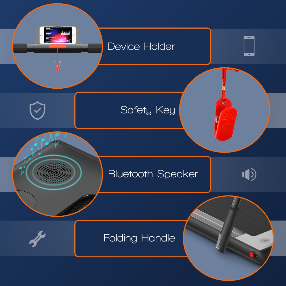 Worth Mentioning Details: Many sweet and thoughtful details allow you to have an excellent exercise experience. Safety lock connecting you with this electric running machine ensures safety workout. Bluetooth speaker and phone holder make you energetic during exercise.