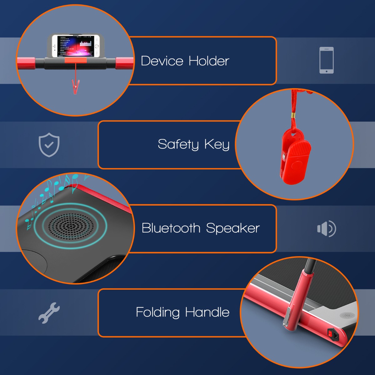 Worth Mentioning Details: Many sweet and thoughtful details allow you to have an excellent exercise experience. Safety lock connecting you with this electric running machine ensures safety workout. Bluetooth speaker and phone holder make you energetic during exercise.