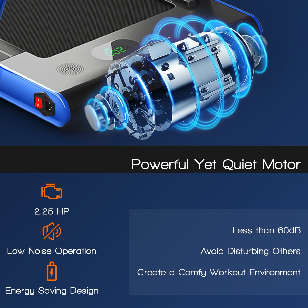 While you run at home, you will not worry about disturbing your family because of the 2.25HP powerful yet quiet motor. Furthermore, this electric treadmill has dual use as an under desk treadmill with speed selected from 1 - 4km/h or a running machine with speed selected from 1 - 12km/h to meet your different exercise needs. Including multiple practical functions, such as clear LED display, Bluetooth speaker, phone holder and APP connect, this motorized running exercise machine makes workout no longer boring. 5-layer shockproof running belt and safety key ensure security workout. When the fitness is finished, just fold the treadmill and move it through 2 built-in wheels.