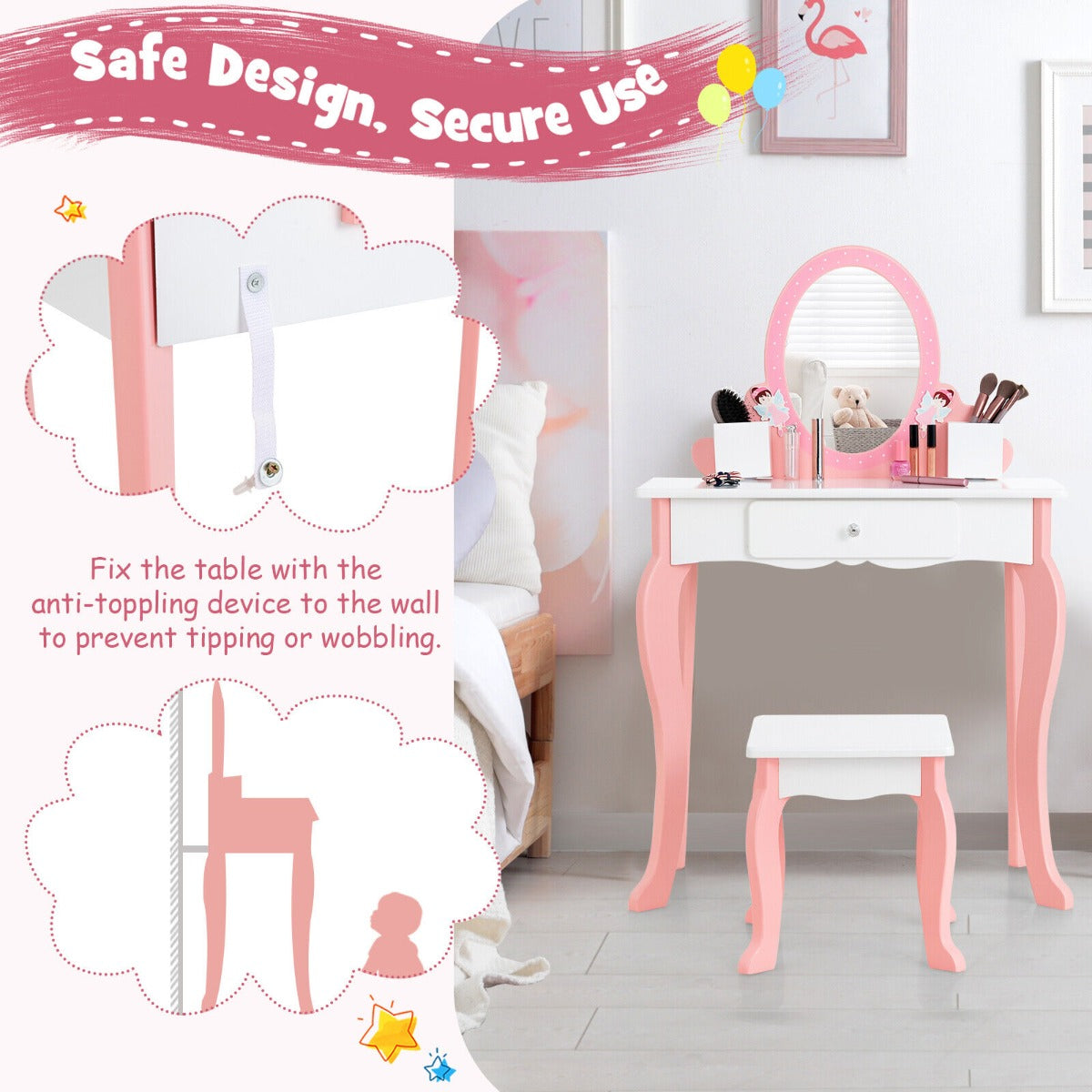 Safe and Stable Design: Crafted from high quality P2 MDF, this kids vanity table and stool set is built for durability and stability. What's more, the anti-toppling device attaches the table tightly to the wall to prevent tipping or wobbling. Meanwhile, there are non-slip foot pads for enhanced stability.