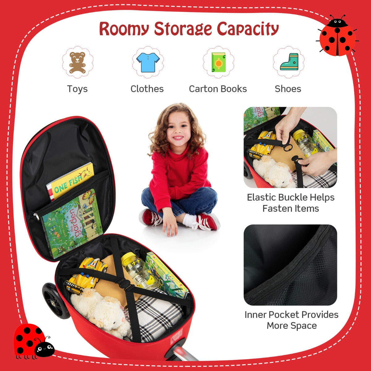 Enjoy outdoor travel or adventure with our kid's scooter suitcase! Our scooter luggage is an essential toy for kids over 5 years old as it can both develop their storage habits and exercise their sense of direction. The 2-in-1 design enables our scooter luggage to serve as a partner for your child's outdoor adventures, and the shock-absorbing PU luminous wheels not only perform well on various roads but also appeal to your child's curiosity. Moreover, there is a brake system at the end of the wheels to reduce safety hazards. In addition, the luggage shell with cartoon patterns is waterproof and sturdy, while the interior has abundant space to place children's favourite books, toys, snacks and other items. What's more, this skateboard luggage can be quickly stored to a compact size, which is easy to carry for trip. Hence, the versatile scooter suitcase for kids is a perfect companion for school, airplanes and camping. Bullet Point: Smooth Scooter with Lighted Wheels: One of the highlights of our 2-in-1 scooter suitcase is its light-up wheels, which will illuminate red, green, and blue 3-colour lights when friction is generated to create cool effect. The premium wheels are made of shock-resistant PU to ensure smooth riding on kinds of roads. And it comes with a brake system for safe riding. Chic Suitcase with Ample Space: The suitcase with cute shark pattern will quickly gain the love of children. In addition, there is a mesh pocket and an internal compartment inside the suitcase that can store your child's snacks, books, clothes, toys and more. Moreover, there is an internal elastic buckle to keep their belongings safe and orderly during the trip. High Quality & Durable Material: The scooter luggage for kids comes with an ergonomic TPR handle, which will release kids hands and ensure stronger grip. Moreover, the smooth suitcase shell is made of waterproof and scratch-resistant EVA to withstand the test of time. And the non-slip scooter is made of sturdy aluminium for 45 kg higher load bearing. Fold & Store at Ease: For convenient transport and storage, our scooter luggage has adopted 4-step folding design. And it can be folded into a compact size measuring 33 cm x 26 cm x 51.5 cm, which is approved for air travel. Therefore, our kids scooter suitcase is suitable for various occasions, such as school, airplanes, cars, etc. Cheerful Gifts for Kids Over 5: Thanks to its versatile design, our kid's scooter luggage is an ideal gift choice for kids over 5 years old to bring up their balance ability, cultivate sense of direction, develop adventure skills and keep positive moods. And it will be a precious toy to accompany your child to spend a most unforgettable childhood time. Features: High-quality PU wheels can adapt to a variety of ground Scooter with built-in brake system ensures safer riding Suitcase with inner pockets can store books, snacks, clothes, etc Comfortable handles are easy to control the direction Attractive patterns and colourful lights stimulate kids' interest Easy to fold within 4 steps for a more space-saving size Waterproof and scratch-resistant suitcase will last for a longer time Proper size is approved by airplane and suitable for multiple occasions The perfect gift for children over 5 years old to develop their adventure ability Specifications: Colour: As the picture shows Material: EVA, PU, Polyester Fabric, Aluminium Overall Dimension: 70 cm x 33 cm x 79.5 cm (L x W x H) Folding Size: 33 cm x 26 cm x 51.5 cm (L x W x H) Net Weight: 3,5 kg Scooter Maximum Weight: 45 kg Suitcase Maximum Weight: 5 kg Recommended Age: 5+ Package Includes: 1 X Scooter Suitcase 1 X User Manual Box Qty:1(May vary by batch)
