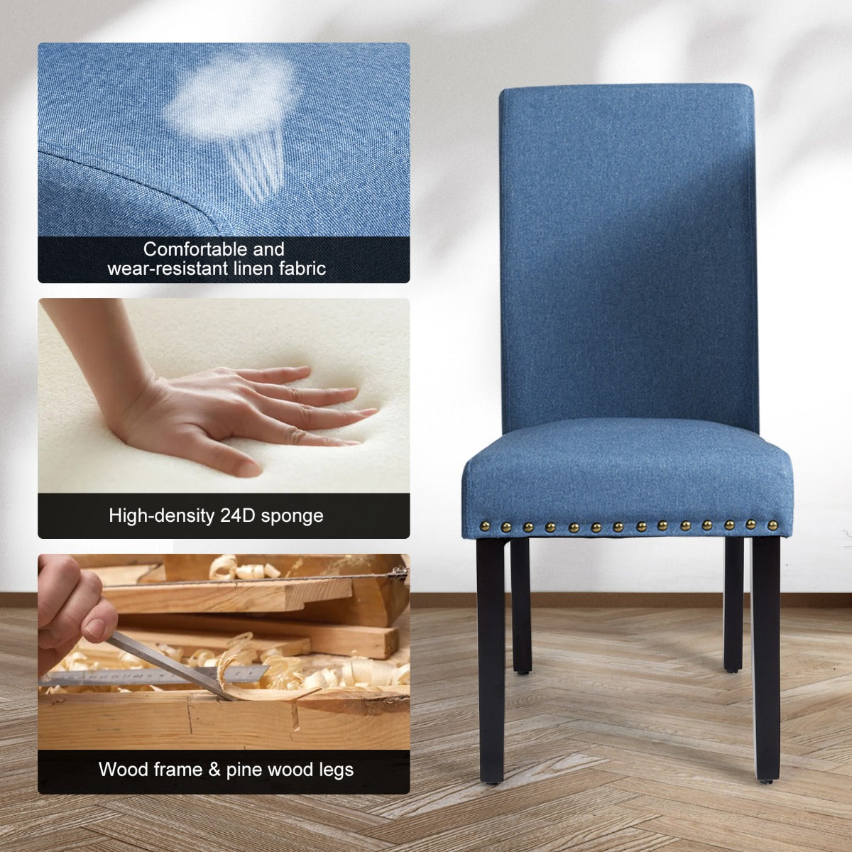 High-Density Sponge & Linen Fabric: These 2 dining chairs are filled with a high-density sponge to offer optimal softness and elasticity. And serpentine springs under the seat make chairs more resilient. Besides, covered with breathable linen fabric, these dining chairs will provide maximum comfort.