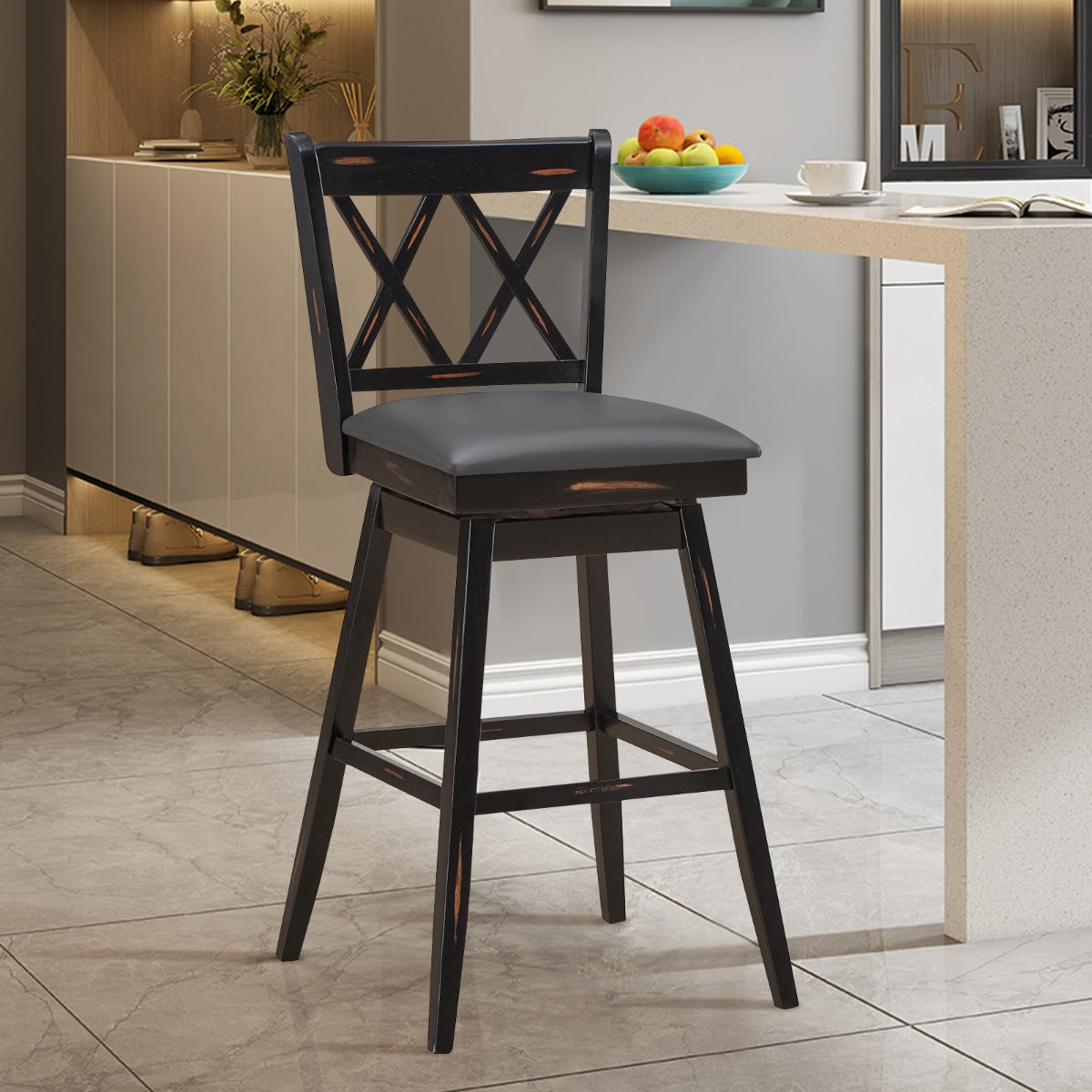 Transform your house or business place with simple elegance and contemporary bar stool. Constructed of a solid rubber wood frame, these bar stools are strong enough to support 120kg without wobbling. And the PVC leather cushion is filled with a soft sponge to offer you comfortable and cozy seating. What's more, it can rotate 360°to bring a wider range of motion. With the waterproof PVC surface, the seat is easy to clean. In addition, this stool has a simple structure, allowing you to install it within a few minutes. The delicate finish and sophisticated appearance make this barstool ideal for various occasions, including living room, office, coffee shop, pub and more.