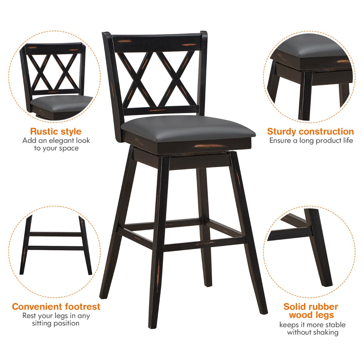 360° Swivel Seat for Convenience: Equipped with a swivel seat, the bar chair allows you and your guests to switch directions freely, which makes conversation easier. The premium footrest can help you rest your legs and find the most comfortable sitting position
