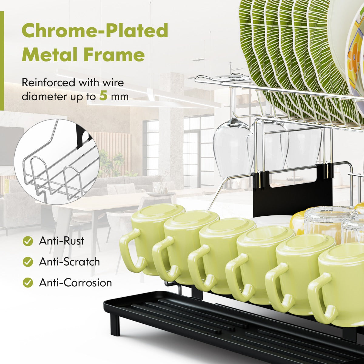 Our 2-tier dish drying rack can hold about 14 saucers, 10 bowls, 6 mugs, 3 glasses and 1 cutting board at the same time, which is suitable for family use. The detachable top layer allows you to freely choose to use 1-tier or 2-ter placing space. Besides, all water will drop into the sink through the 360° swivelling spout of the drip tray. Heavy-duty metal frame with anti-slip feet keeps it durable and stable. Additionally, it's easy to assemble and clean.
