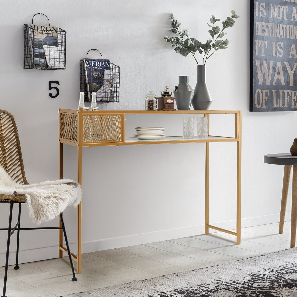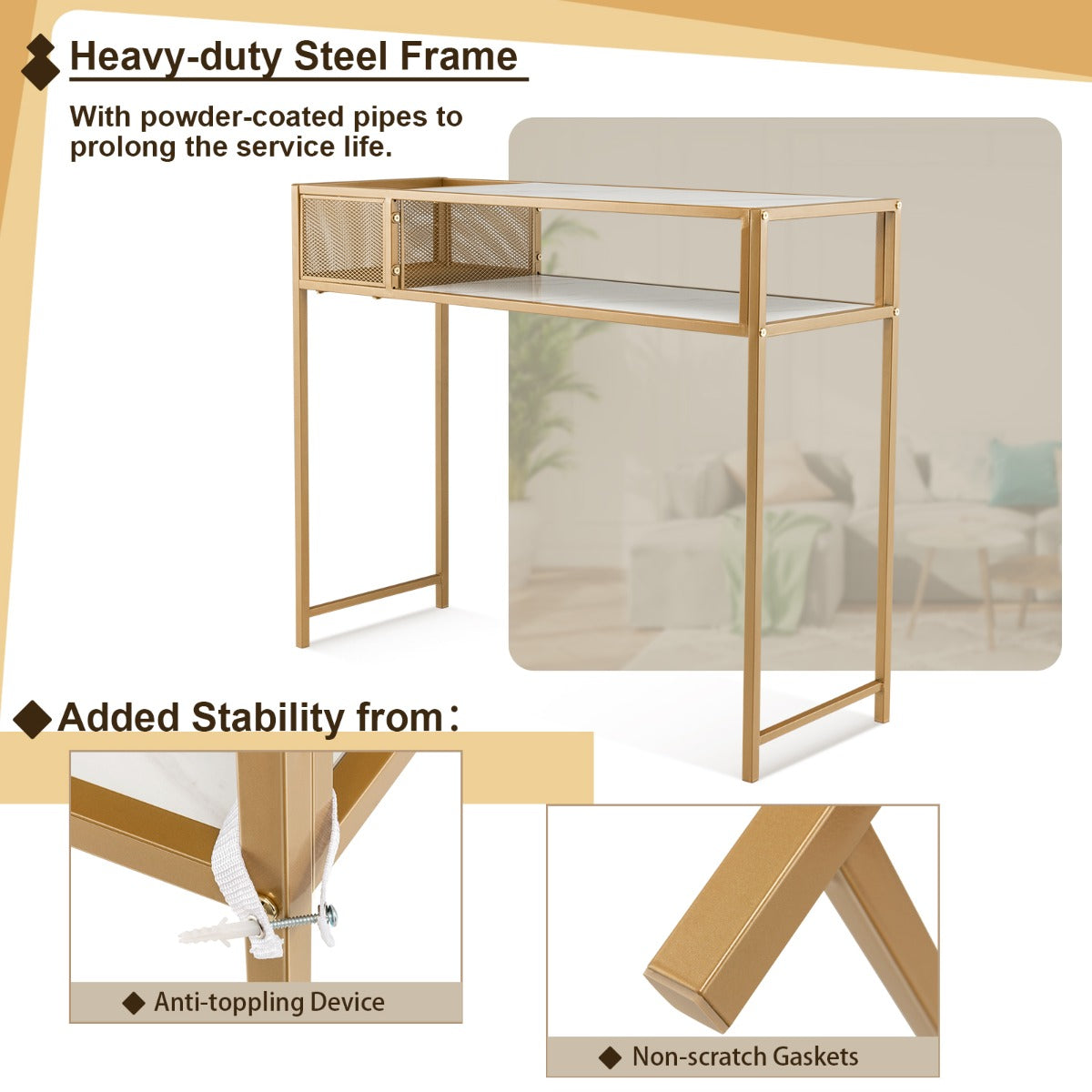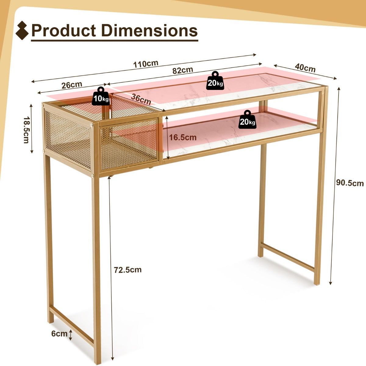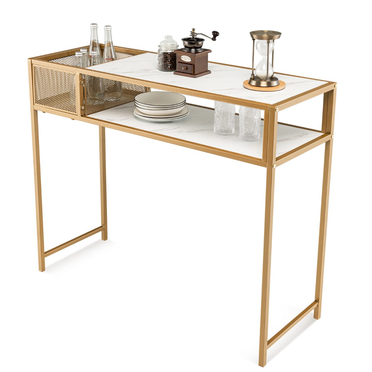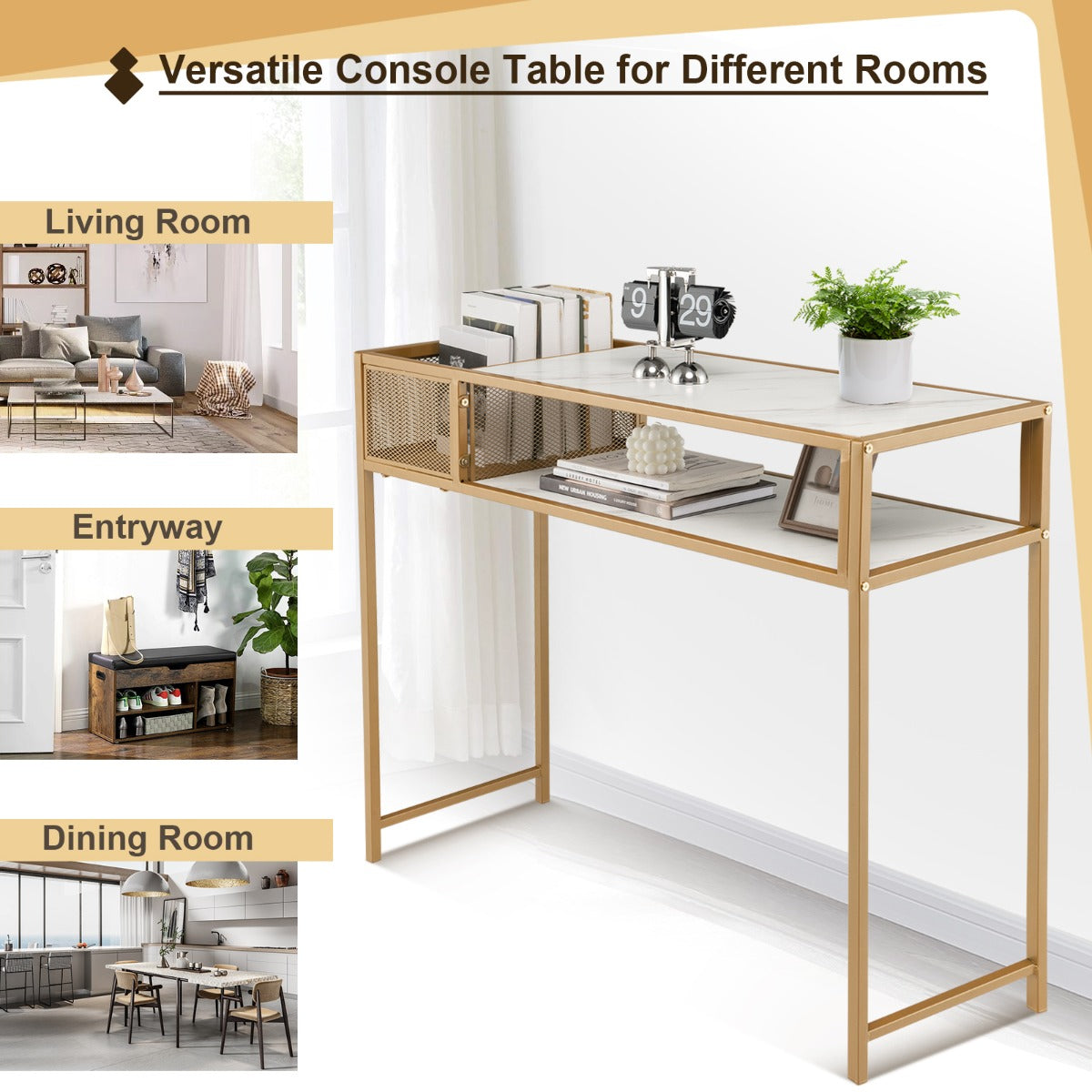 Have you found a practical yet stylish console table? This chic entryway table would be one of your ideal choice. The sleek lines, faux marble tabletop as well as gold steel frame add a sense of charm to your home and show your great taste, making this sofa table a stunning addition for various places. In addition, wide tabletop, open shelf and storage basket can well suit your different needs, which is a great storage solution for optimizing space and also makes your room more tidy and clean. The combination of MDF tabletop and heavy-duty steel frame brings long-lasting reliable service to you. Meanwhile, the hallway table is equipped with anti-toppling device for higher stability. All in all, the console table is a charming complement for any place, such as living room, bedroom, entryway, etc.