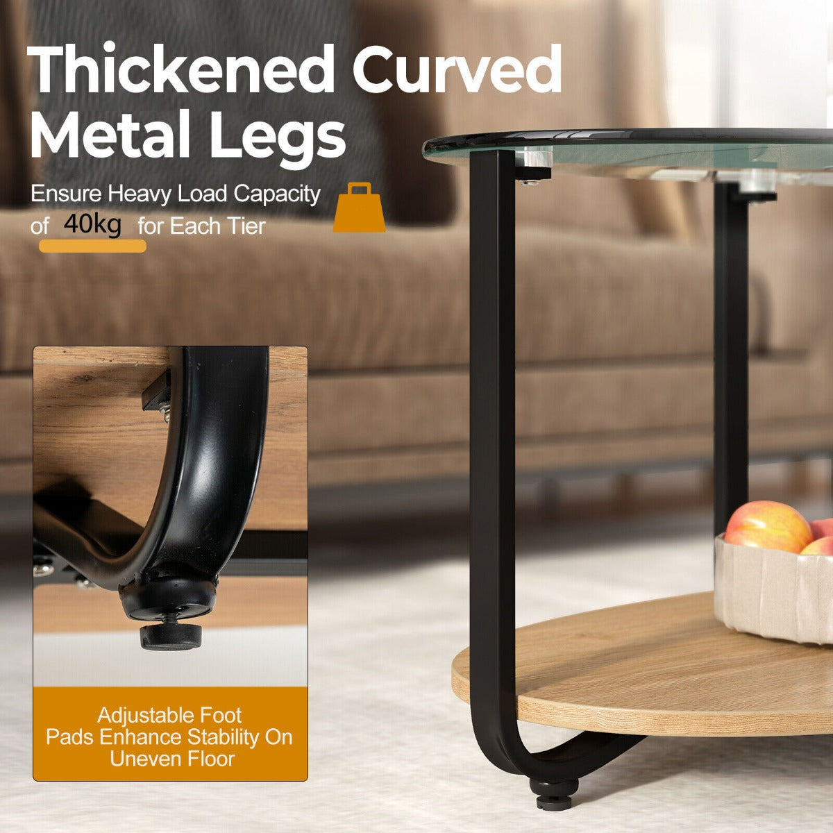 Enhanced Metal Frame for Lasting Durability: Thanks to the heavy-duty iron construction, this sofa side table ensures high stability and long-term use. Besides, the bottom adjustable foot pads help the table to keep steady on uneven floors. And the tempered glass tabletop and bottom wear-resistant wooden shelf can load up to 40kg separately.