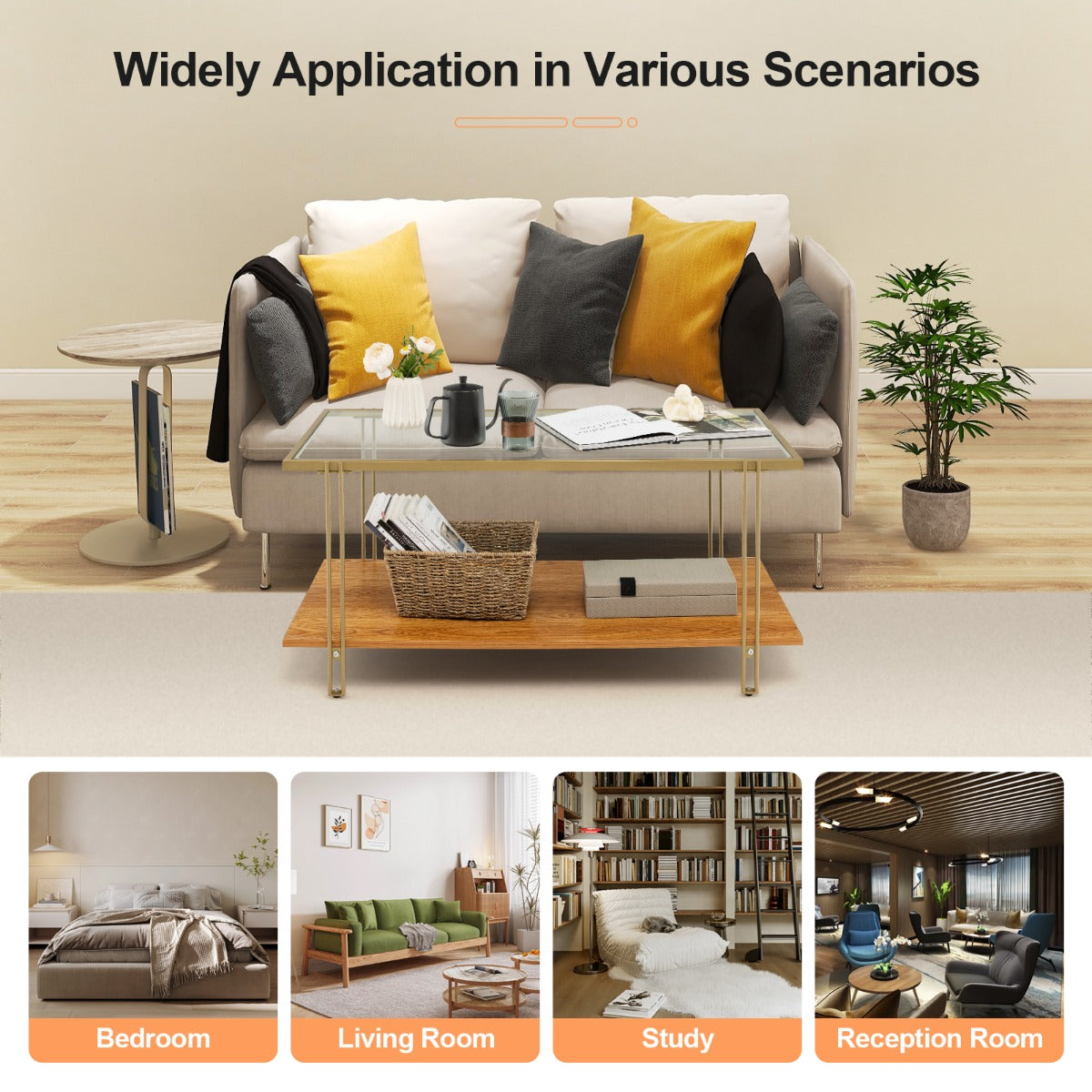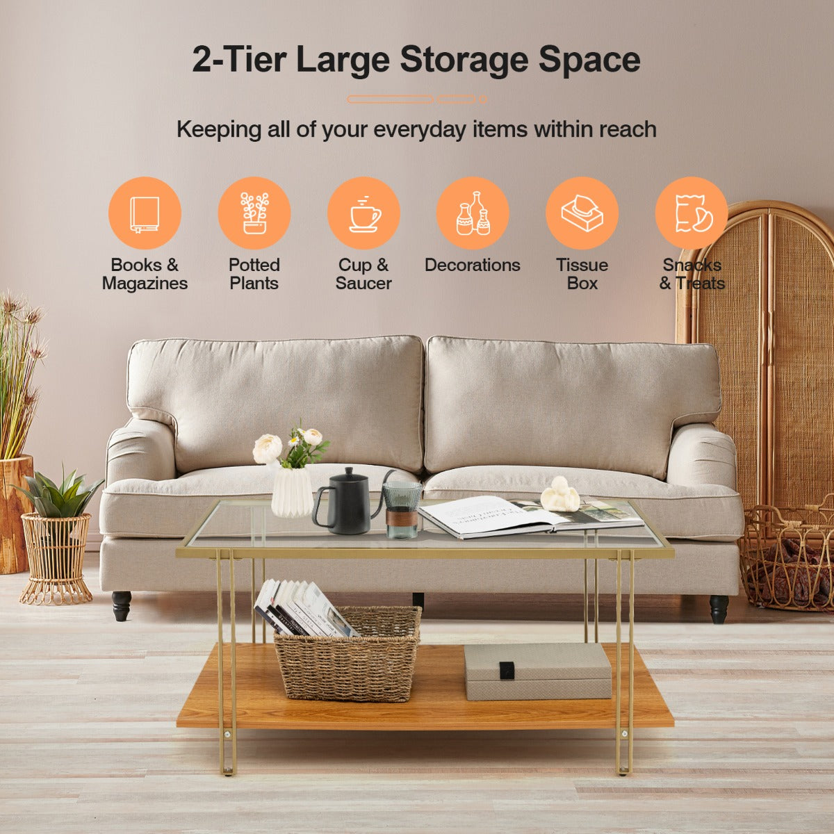 NNECW 2 Tier Rectangular Coffee Table with Gold Steel Frame and Storage Shelf for Living Room