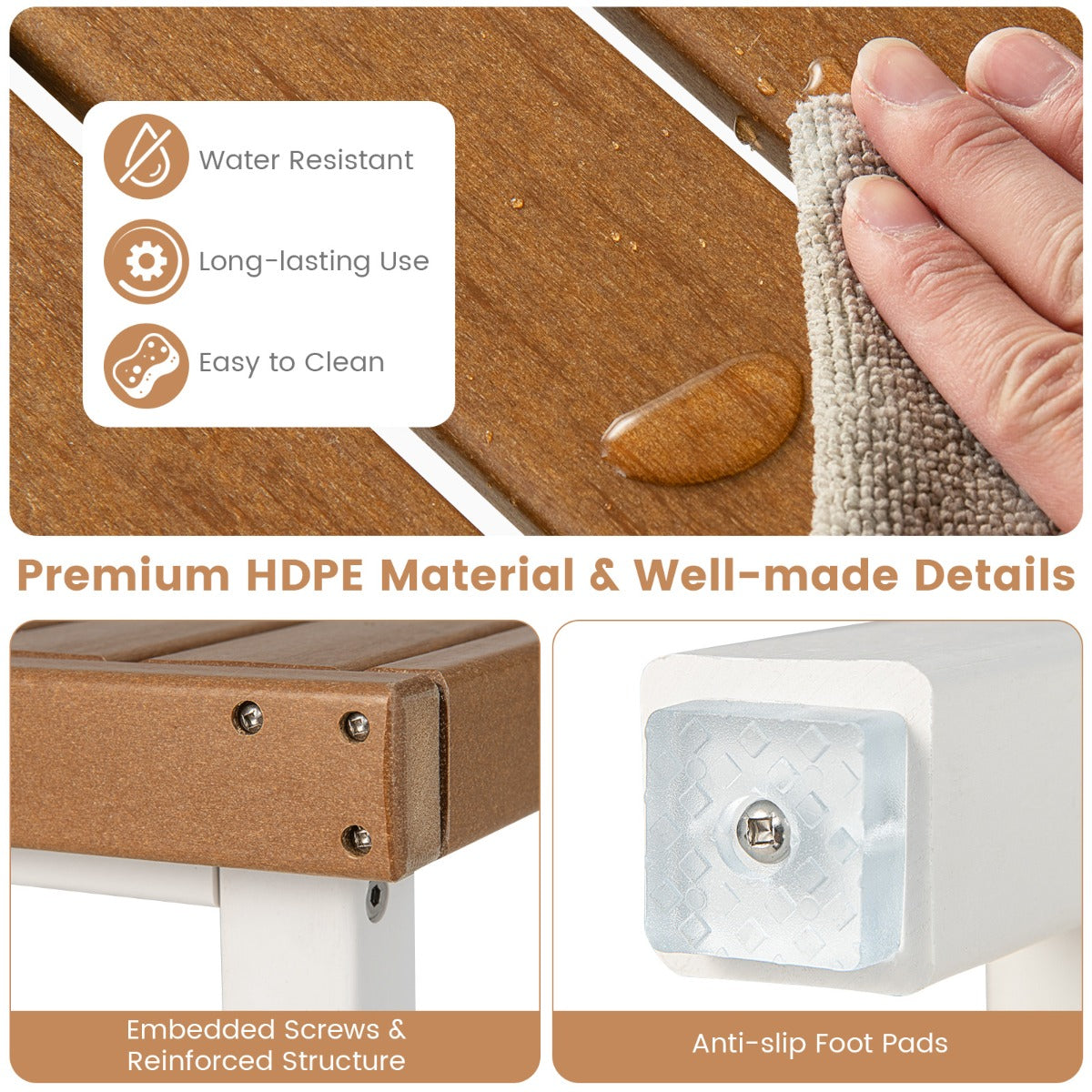 The 2-tier shower bench offers more storage space for your items and also makes it easier to find and get what you need. Crafted from high-quality HDPE material with good water resistance, mould resistance and high sturdiness, this shower bench can be used for a long time. The wide seat with a strong weight capacity of 150 kg allows you to sit on it to shave your legs or change your shoes. Besides, this shower bench can also be used as a side table or a stool in the living room, bedroom, hallway, etc. The waterproof surface is easy to clean while the anti-slip foot pads make the bench more stable.