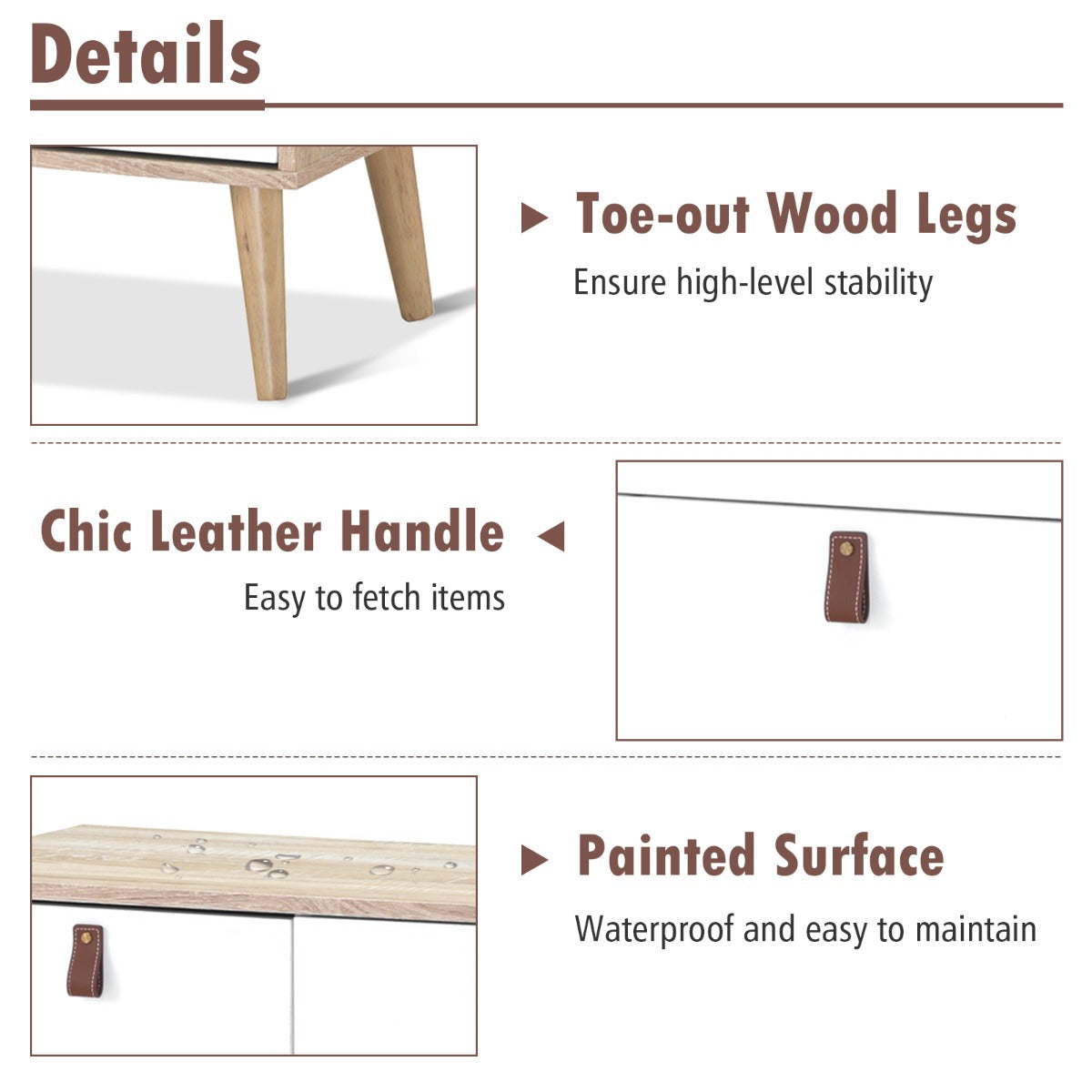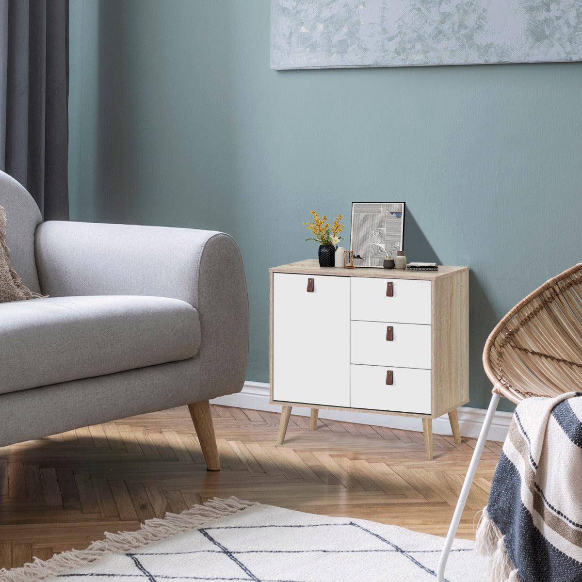 With 3 large drawers and a side cabinet, our chest of drawers can perfectly accommodate all your daily necessities, including clothes, cosmetics, digital products and more. In addition, the inner shelf of the side cabinet can be adjusted in three positions, making it easy for you to store different sizes of items. The wide top is perfect for holding alarm clocks, coffee mugs and other frequently used items. The anti-tilting device ensures the cabinet's safety, while the smooth glides and convenient handles make it easier for you to reach the items inside. You can put it in your living room as a storage cabinet or in your kitchen as a cupboard. The elegant shape makes it not only functional but also a decorative piece of furniture with aesthetic value. Bullet Points: Large Storage Space: With 3 large capacity drawers and a side cabinet, this storage cabinet will provide you with plenty of storage space. The shelves in the side cabinet are adjustable in three positions, making it easy for you to store larger items. And the wide tabletop is perfect for placing decorative items, photo frames or small potted plants. Long-time Lasting Cabinet: Made of high-quality thickened boards, this chest of drawers is perfect for long-term use! The raised support legs make the cabinet less susceptible to moisture and make it easy for you to clean the space underneath. In addition, the surface of the cabinet is smooth and waterproof, making it very easy to clean. User-friendly Design: This cabinet is equipped with a safe anti-toppling device. You can easily fix the drawer cabinet firmly to the wall, which will effectively prevent your little angel from accidental injury. The cabinet comes with convenient handles and smooth slides, so you can easily access your items at any time. Suitable for Various Scenarios: With its clean lines and classic style, this multi-level chest of drawers can be matched with various styles of furniture. You can use it not only as a storage unit in your living room but also as a buffet cabinet in the kitchen or an entryway cabinet in your home. Easy to Install: The product comes with a detailed instruction manual and all parts of the cabinet will be numbered to help you complete the installation quickly. Don't forget that the package also comes with ringmaster stickers to help you hide the screw holes in your furniture. Feature: Provides you with ample storage space: includes 3 storage drawers and 1 side cabinet with door Smooth, water-resistant cabinet surface is very easy to clean Raised support feet make it easy for you to clean the space under the cabinet Made of thicker panels, the cabinet is sturdy and ideal for long-term use Anti-tilting device helps to fix the cupboard on the wall and enhance stability Multifunctional drawer cabinet: can be used as a credenza, buffet, storage cabinet, etc Comes with detailed instructions for easy installation Specification: Colour: Natural/Coffee Material: Engineered wood, MDF Overall dimensions: 80 x 39.5 x 61.5 cm (L x W x H) Weight capacity of top: 25 kg Weight capacity of each shelf: 5 kg Weight capacity of each drawer: 4 kg Net weight (natural): 26 kg Net weight (coffee): 28 kg Package includes: 1 x 3-Drawer Dresser 1 x Instruction Box Qty:1(May vary by batch)