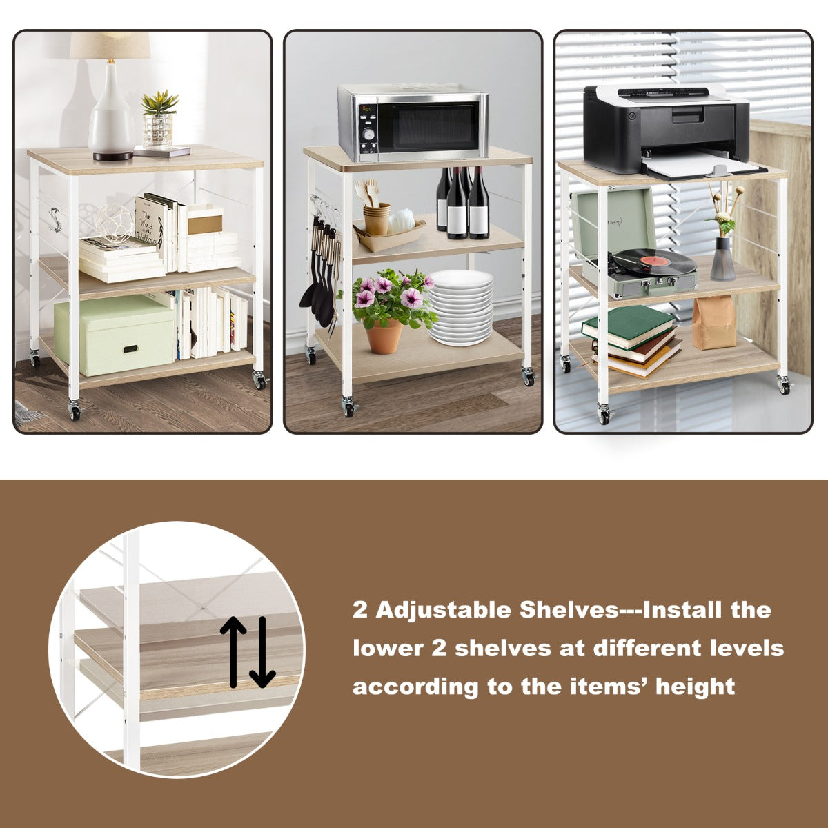 Ample Storage Space & Adjustable Shelf: The kitchen island has a 3-tier structure. The wide tabletop can hold your microwave or other kitchen electronic appliance while the lower two shelves can store your plates, spices, bottles. You can adjust the position of the shelves to fit the items in different sizes and organize them better.