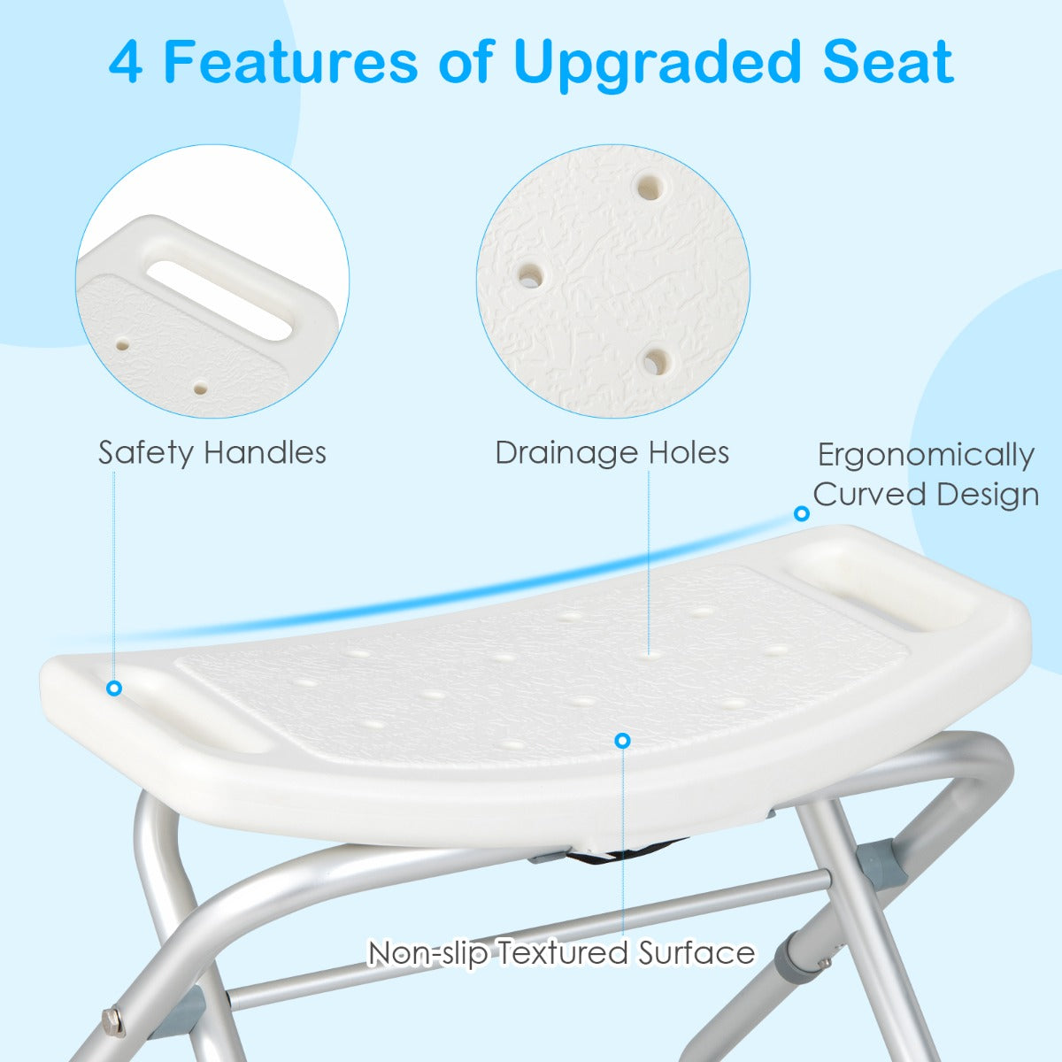 Spacious Seat with Humanized Designs: The spacious seat with ergonomic curve is comfortable to sit for long time showering. Also, the seat is designed with lots of drainage holes to avoid water from accumulation. Besides, both sides of the seat are equipped with safety handles to give a help for who has trouble getting up.