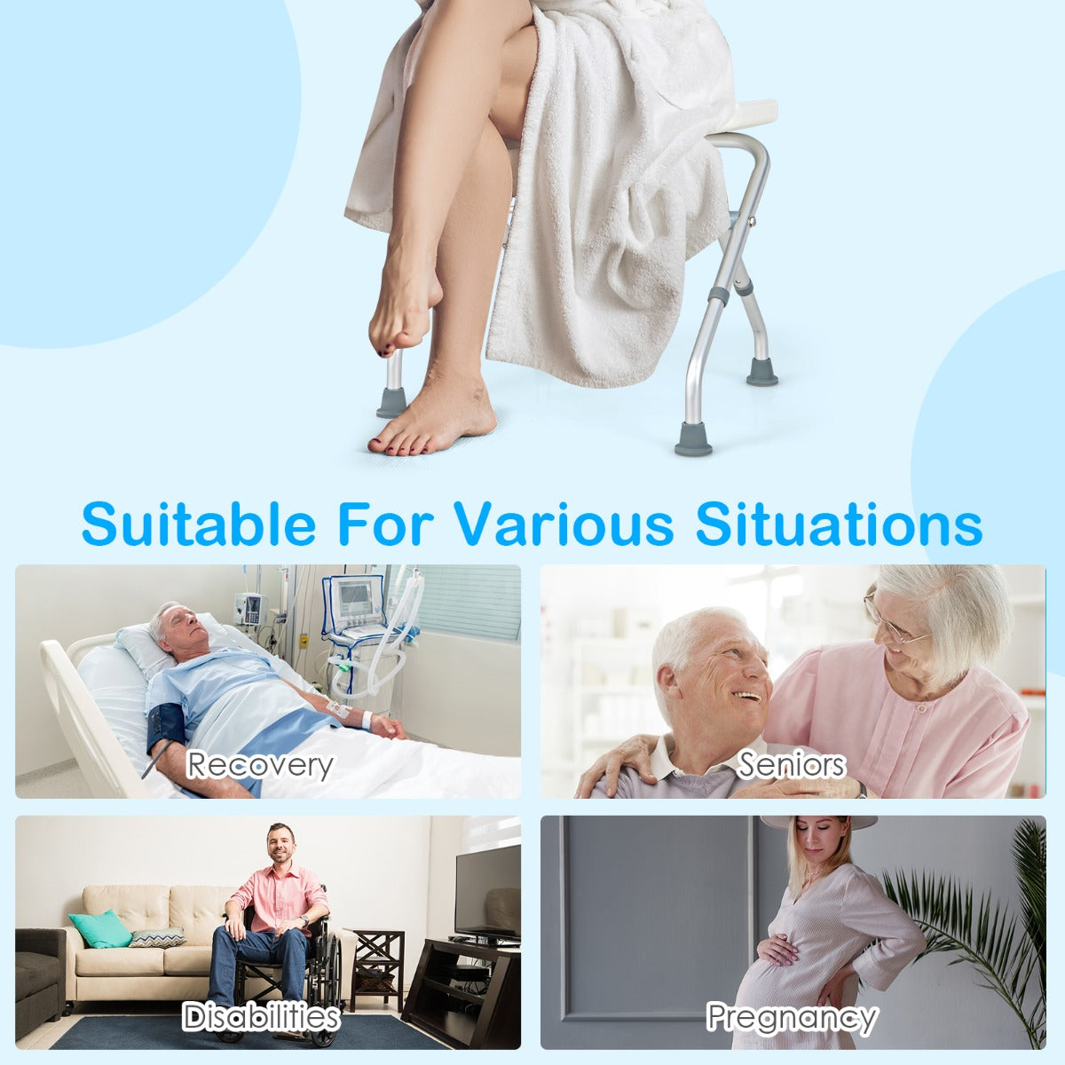 Compatible to most bathrooms, including walk-in shower and bathtub