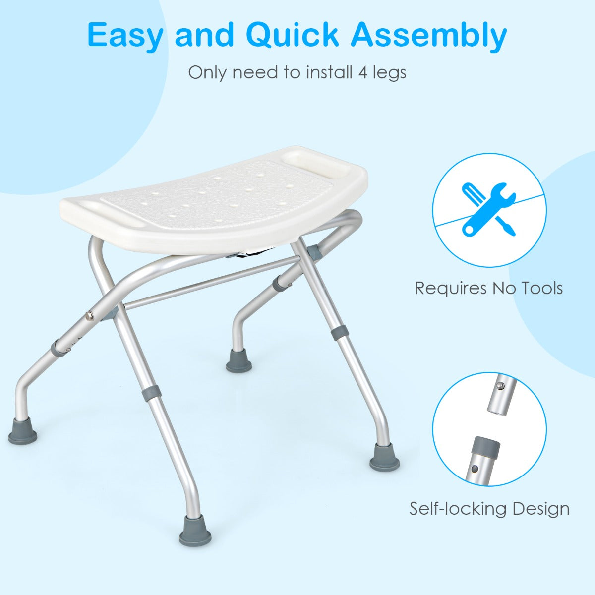Tool-Free Assembly & Adjustable Height: Users only need to install 4 legs before using and the installation is easy and quick with the self-locking design. The bath bench features 3 adjustable heights and the adjustment is simple by pressing the snap button, which is friendly to the elderly.