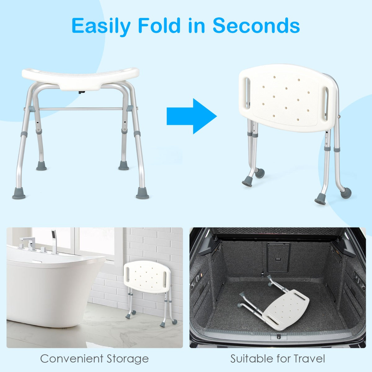 Easy to Fold & Wide Application: The bath chair is quick to fold, which is convenient for storage or traveling. Despite its foldability, the bath chair about 2 kg, which makes it effortless to carry. Also, this foldable bath chair is compatible to most bathrooms, including walk-in shower and bathtub.