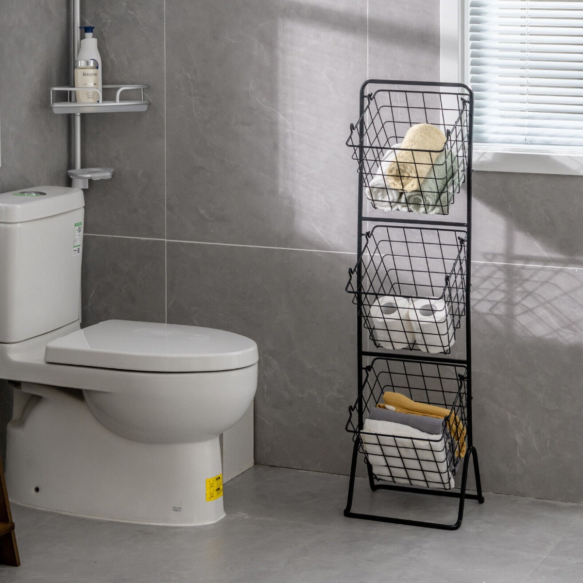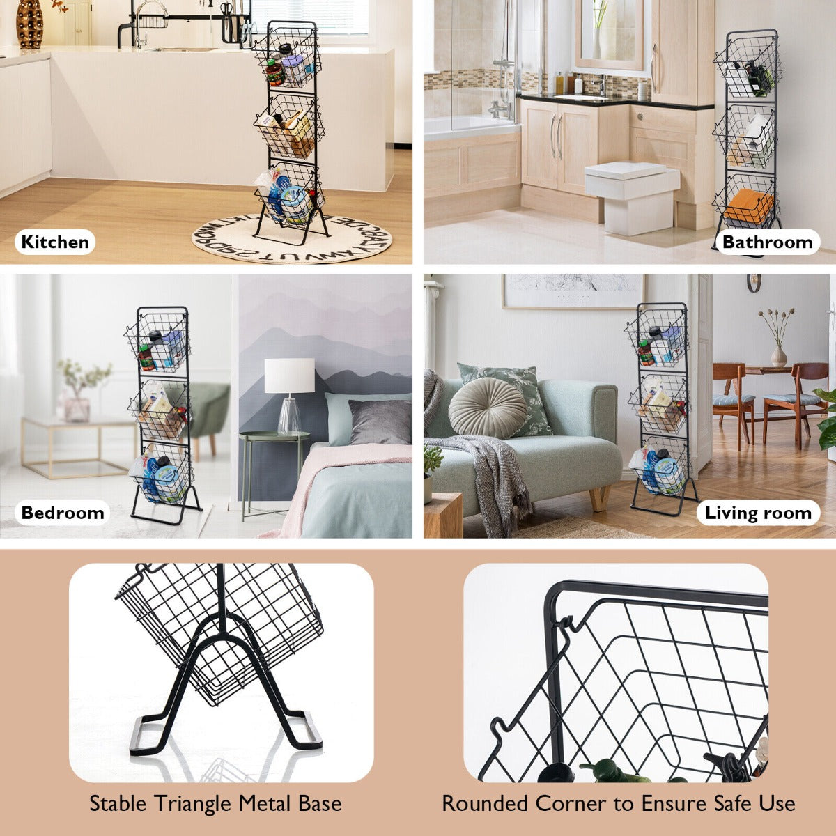 3-Tier Basket Stand: This free-standing storage stand comes with 3 large-capacity metal wire baskets, offering additional space to store fruit, vegetables, snacks, books, toiletries, etc. Each basket bin is removable and can be separately used as a countertop organizer, a fruit bowl or anything else, just as you like.