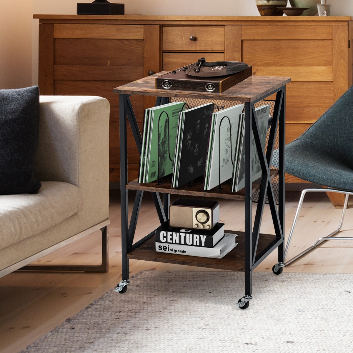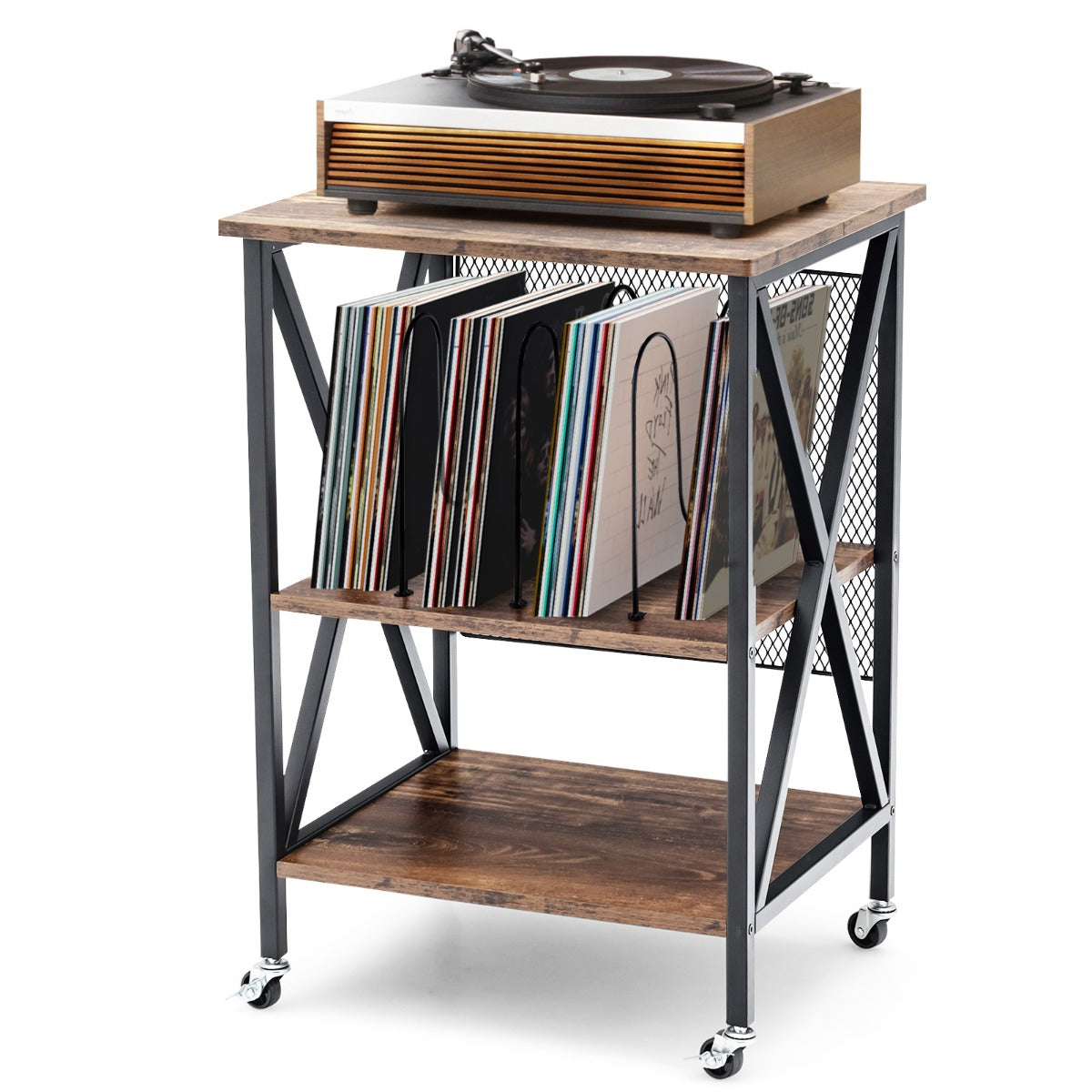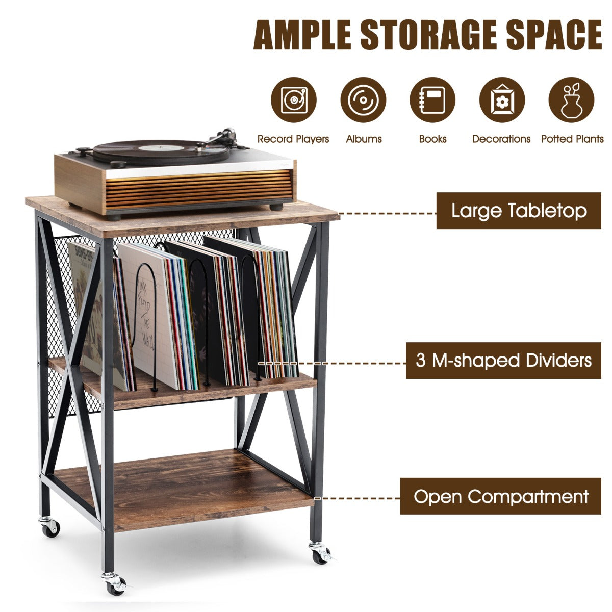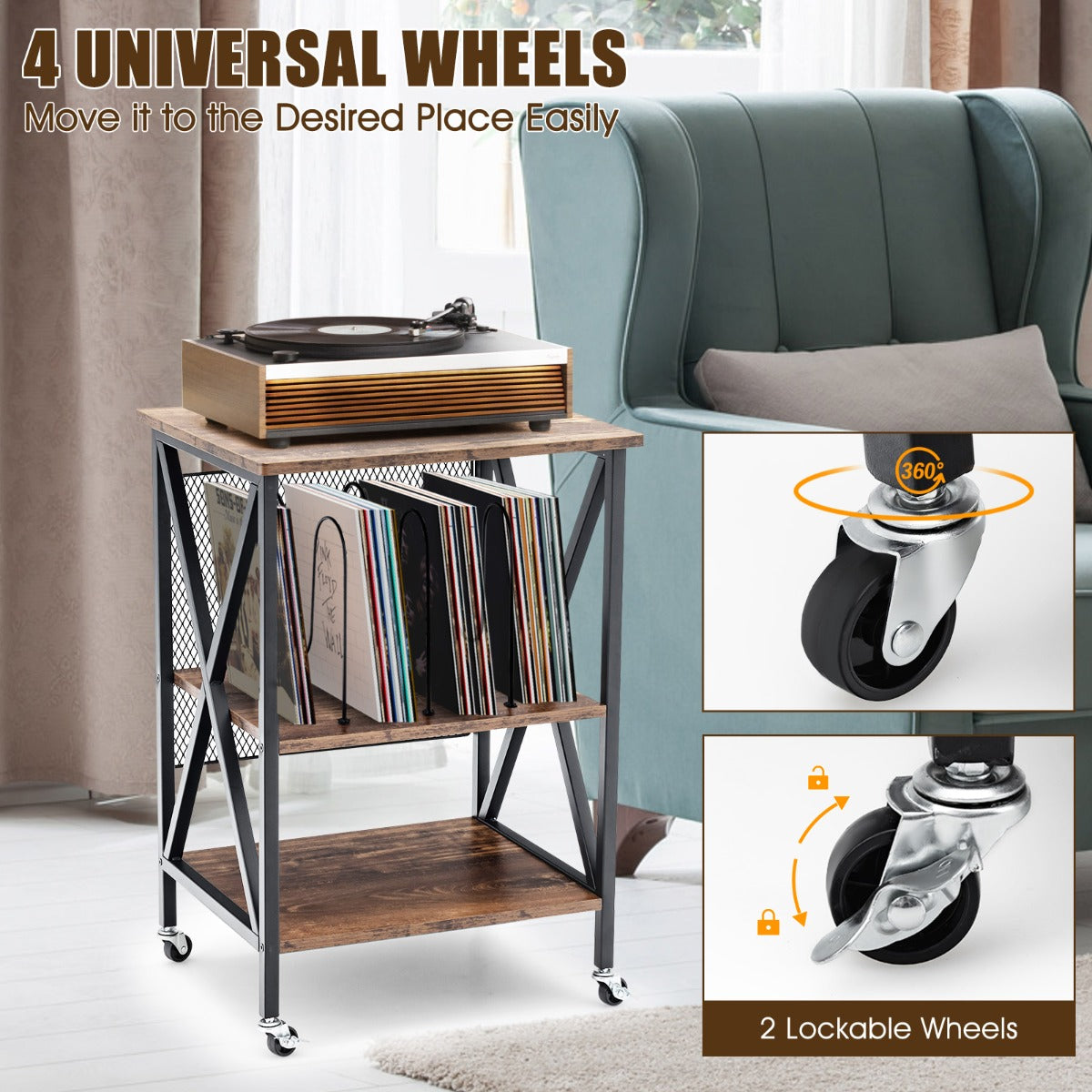 Have you ever been troubled by vinyl records in your home with nowhere to store? Our record player stand would be worth considering. It comes with 3 dividers and bottom shelf to organize your cherished albums, vinyl records and CDs. Plus, the cabinet top is a perfect platform to place turntable. Considering durability and sturdiness, the combination of engineered wood and solid steel frame promises longer service life. Moreover, 360° smooth rolling wheels realize convenient and quiet movement on different floors. Besides, 2 casters with brakes can lock this turntable stand in place and enhance stability. In addition, this rustic vinyl record storage holder can be used as an album organizer, nightstand, and end table, whether in living room or bedroom. Bullet Point: 3-tier Shelf to Enlarge Display Space: The vinyl record storage holder features 3 dividers to provide ample storage and display space for 250 albums. The cabinet top measures 52.07 x 45.72 cm, which is spacious enough to hold your record player. Besides, you can put some vinyl records, CDs and books on the bottom shelf. Rugged & Durable Structure: Made of thick and durable engineered wood, the turntable stand show perfect performance in lasting durability and great load bearing capacity. The cabinet top and each shelf can bear up to 110 lbs and 44 lbs individually. Plus, heavy-duty steel frame also provides ultra reliable support for the record player stand. Compact Size & Easy Movement: With the compact size of 20.5 x 29.5 x 18 inch (L x W x H) , the turntable stand only takes up small space. The record player stand is equipped with 4 smooth rolling wheels for quiet and easy movement. And 2 lockable wheels keep the turntable stand in place when it stops. Versatile Turntable Stand in Retro Style: Its vintage style will perfectly match well with other furniture and add aesthetic beauty to your living surroundings, whether in living room or bedroom. More, the turntable stand serves well as an album organizer, nightstand, and end table. Easy Assembly & Clean-up: So simple its structure it is that there is no need to worry about how to put all parts together. All parts and components are tightly wrapped. Detailed instruction helps you shorten assembly time. Also, the smooth surface brings much more convenience in daily clean-up. Features: Thick engineered wood ensures durability and longer service life Heavy-duty steel frame is not easy to wobble or shake 3 dividers can accommodate 250 albums and vinyl records Wide cabinet top facilitates the placement of record player Bottom shelf provides enough space for books, albums and ornaments Equipped with 4 smooth rolling casters for easy movement Lockable wheels further enhance its overall stability Vintage design matches seamlessly with interior decoration Used as an album organizer, turntable stand, nightstand, and end table Perfectly fits your living room, bedroom and so on Easy to assemble under the guidance of instruction Specifications: Colour: Brown Material: Engineered Wood, Steel Product Dimensions:52.07 x 74.93 x 45.72 cm (L x W x H) Net Weight:9.98 kg Package Includes: 1 x Record Player Stand 1 x User Guide Box Qty:1(May vary by batch)