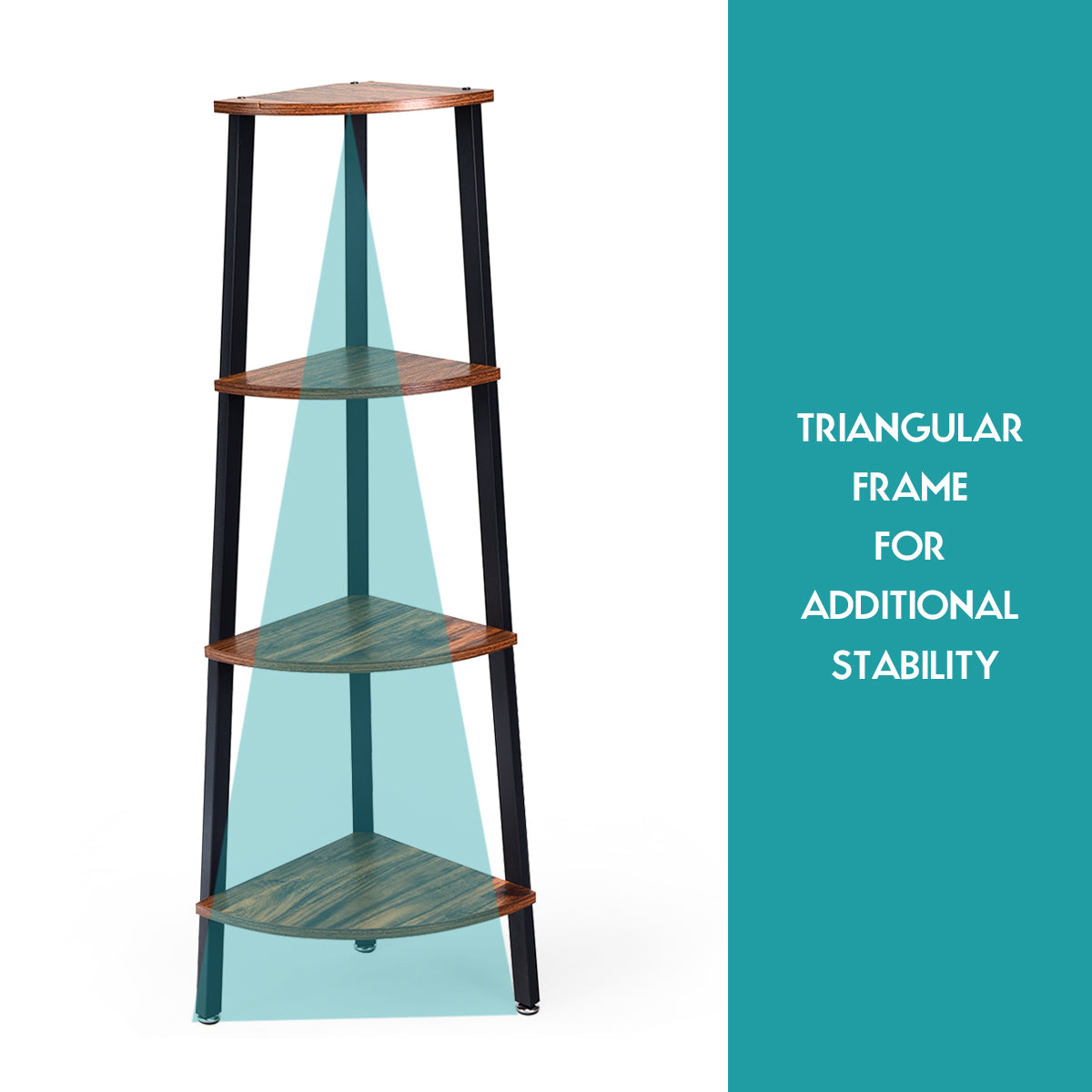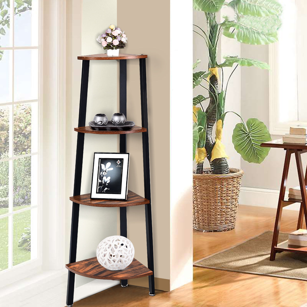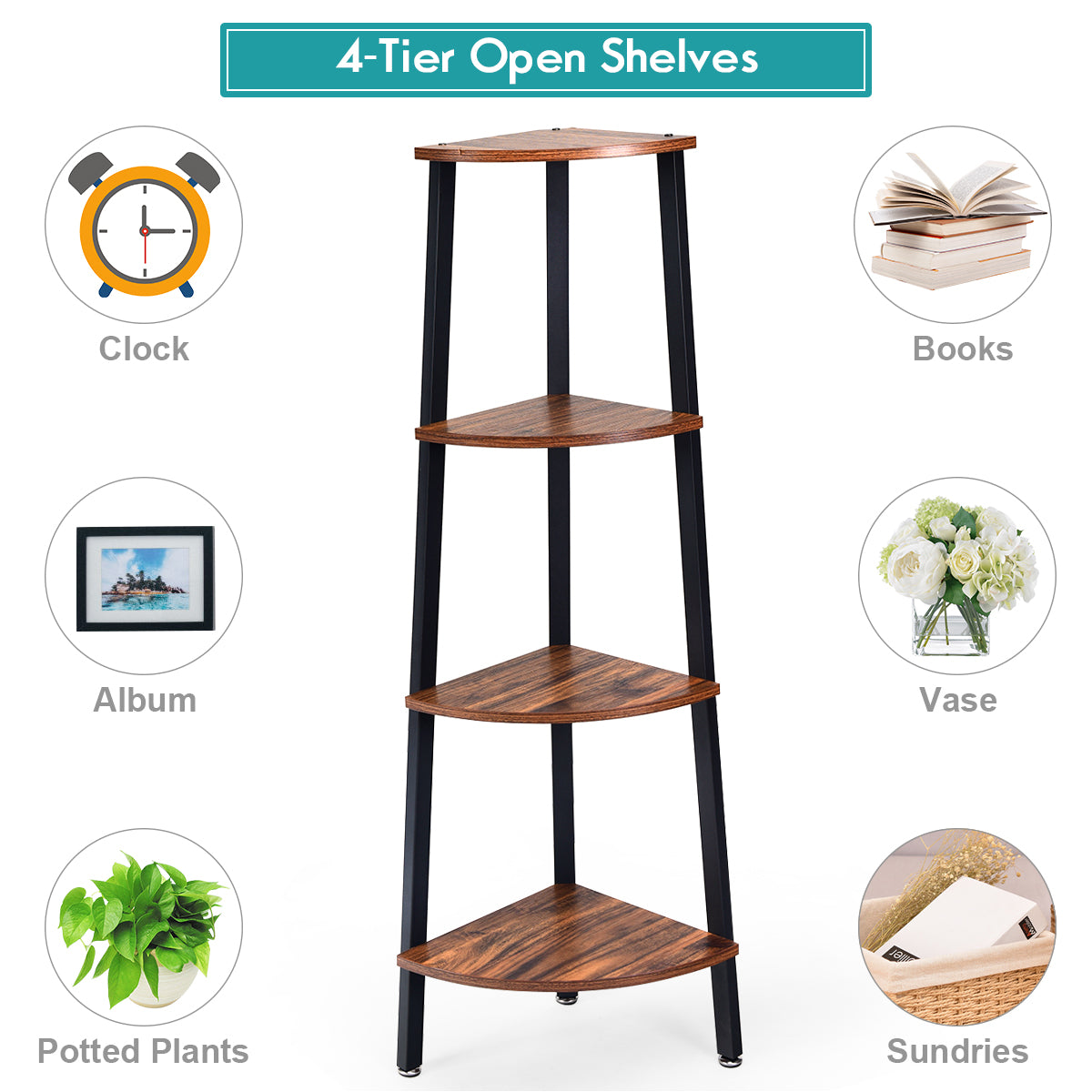 Large Storage Space: Our corner shelf has 4 tiers in all and the space increases from top to bottom. It is large enough to place a mass of books, toiletries and potted plants. The height between layers is adequate to hold items of different sizes. Open shelves for maximizing storage and exhibition. It is convenient to keep everything you use in a suitable place.