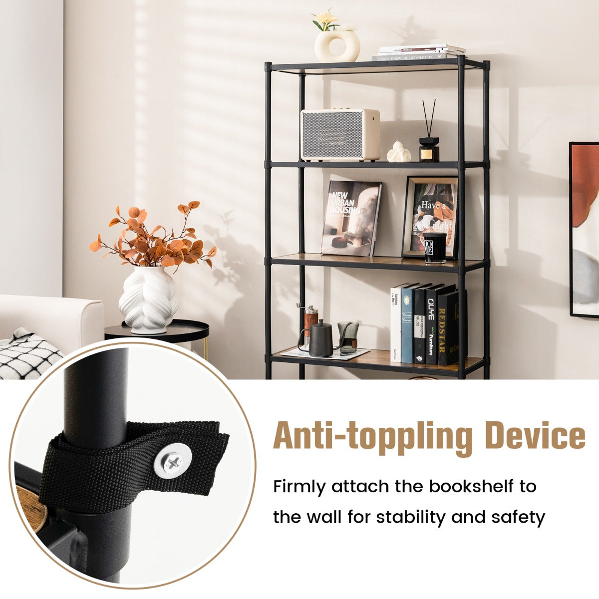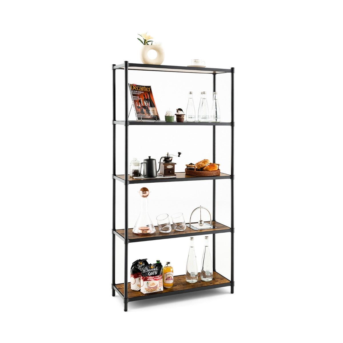 Crafted from wooden shelves and metal frame, this bookcase provides good durability and stability. Moreover, the anti-toppling device keeps the shelf more stable and provides more security for your family. Featuring 5 tiers open shelves, you can store your books, decorations, kitchenware on the shelves, thus keeping room tidy. This multipurpose storage rack is prefect for kitchen, living room, bedroom, laundry room and so on. With delicate wood shelves and simple design, the storage shelf can match with any home style. This storage rack can be assembled in different ways to create personalized storage space for your room. You could quickly assemble it and enjoy the fun of DIY assembly. Whether for storage or display or everyday use, it is an attractive and quality shelf unit.