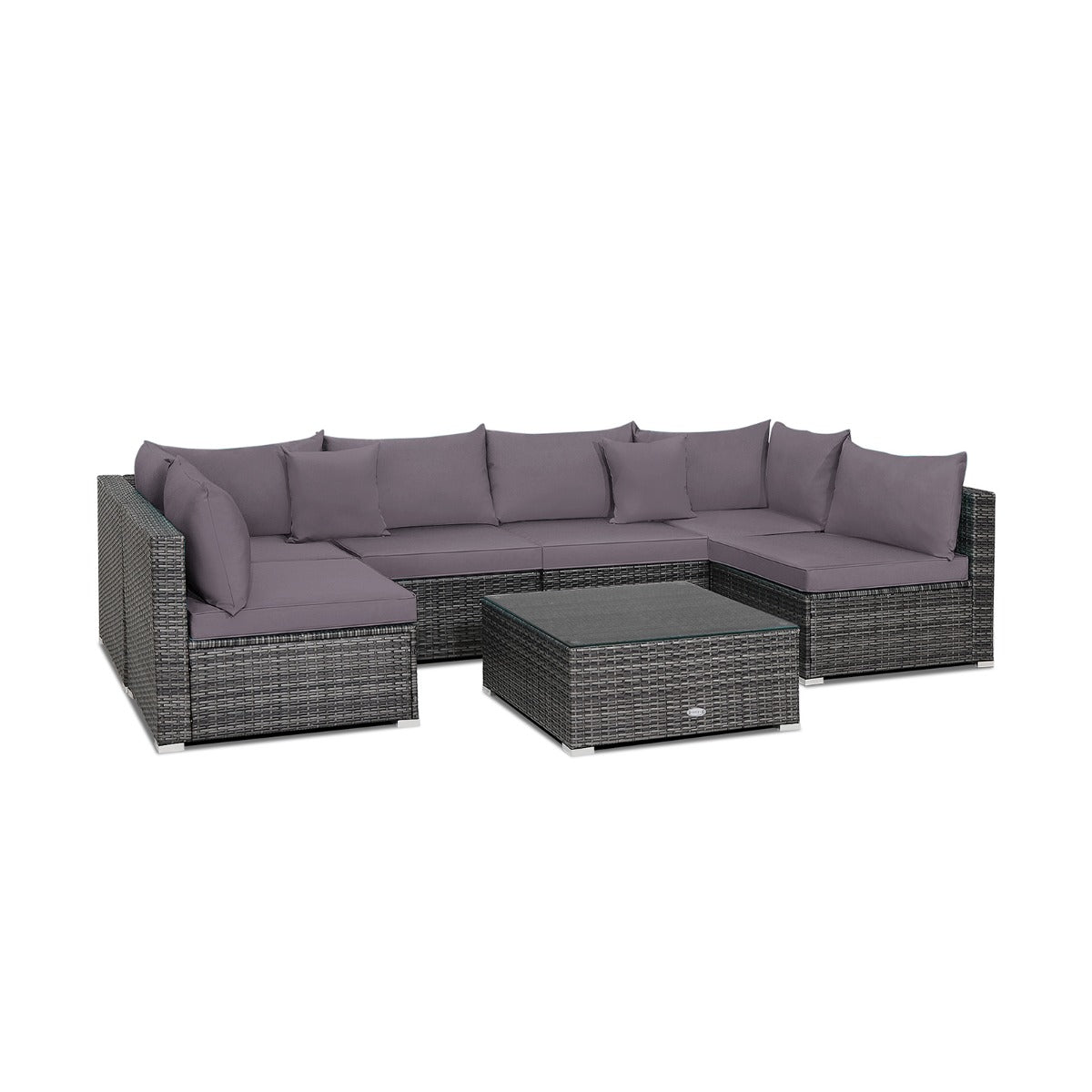 With this 7-piece patio rattan sofa set, you will spend soothing leisure time with your friends or family. Constructed of a stable steel frame and well-woven rattan, both the table and sofas are of high stability and suitable for long-time outdoor use. Each piece is designed with L-shaped aluminium feet on the bottom to avoid wobbling. And 10 fastener clips are provided to connect the sofas firmly. In addition, the sofa set will bring you a comfortable sitting experience with seat cushions, back cushions and throw pillows. The zipper design makes the cover of cushions and pillows easy to remove and clean. What's more, the coffee table is practical and allows you to easily fetch the items you want. The tempered glass table fixed by 4 suction cups is super sturdy and resists scratches well. You can combine the 7 pieces according to your demands and the size of the relaxing area. All in all, this 7-piece patio rattan set will be a perfect option for outdoor relaxation.