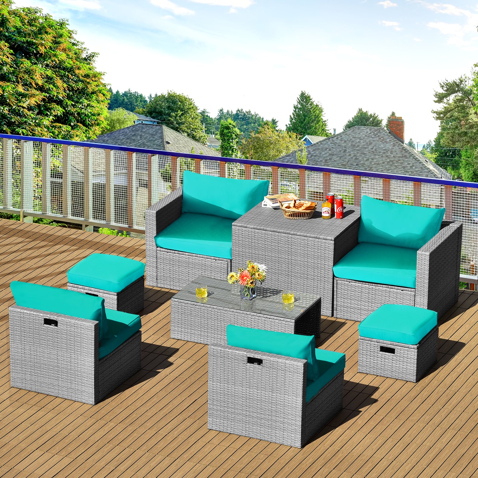 NNECW 8-Piece Outdoor Grey PE Rattan Conversation Set with Washable Cushion Covers-Green