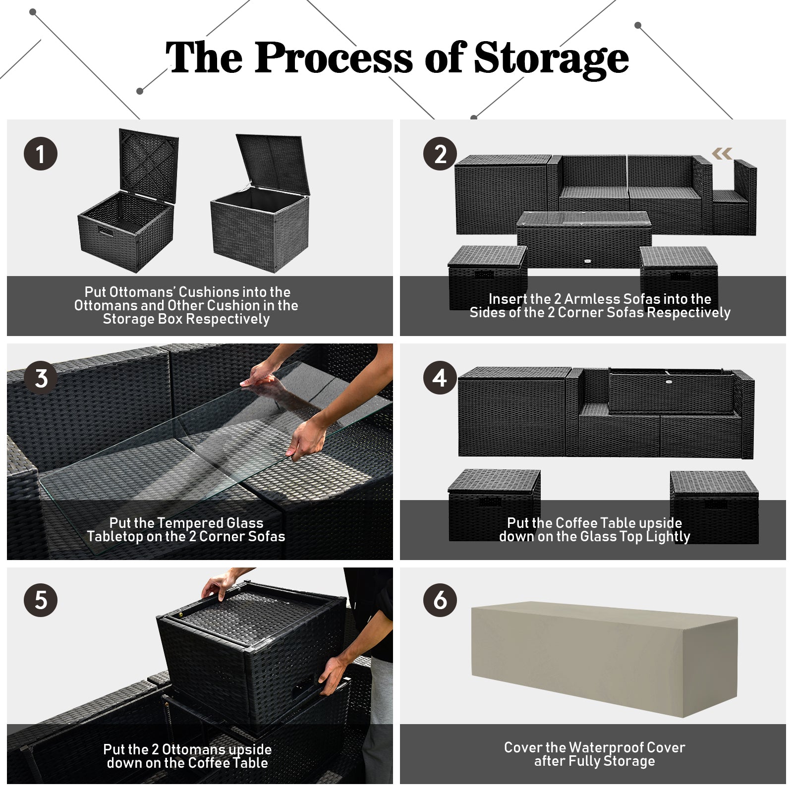 It's time to rearrange your outdoor space with this 8-piece outdoor furniture set! With 1 tempered glass coffee table, 1 storage box, 2 ottomans, 2 armless sofas and 2 corner sofas, this outdoor conversation set comes with various layouts for you to explore. Furthermore, the soft cushions and ergonomic backrests bring a comfy sitting experience. After finishing the outdoor gathering, you can transform this patio sectional set into a compact size, greatly saving your space. Moreover, the waterproof cover, all-weather PE rattan, anti-rust steel frame and non-slip foot pads endow the characteristics of durability and stability for outdoor use.