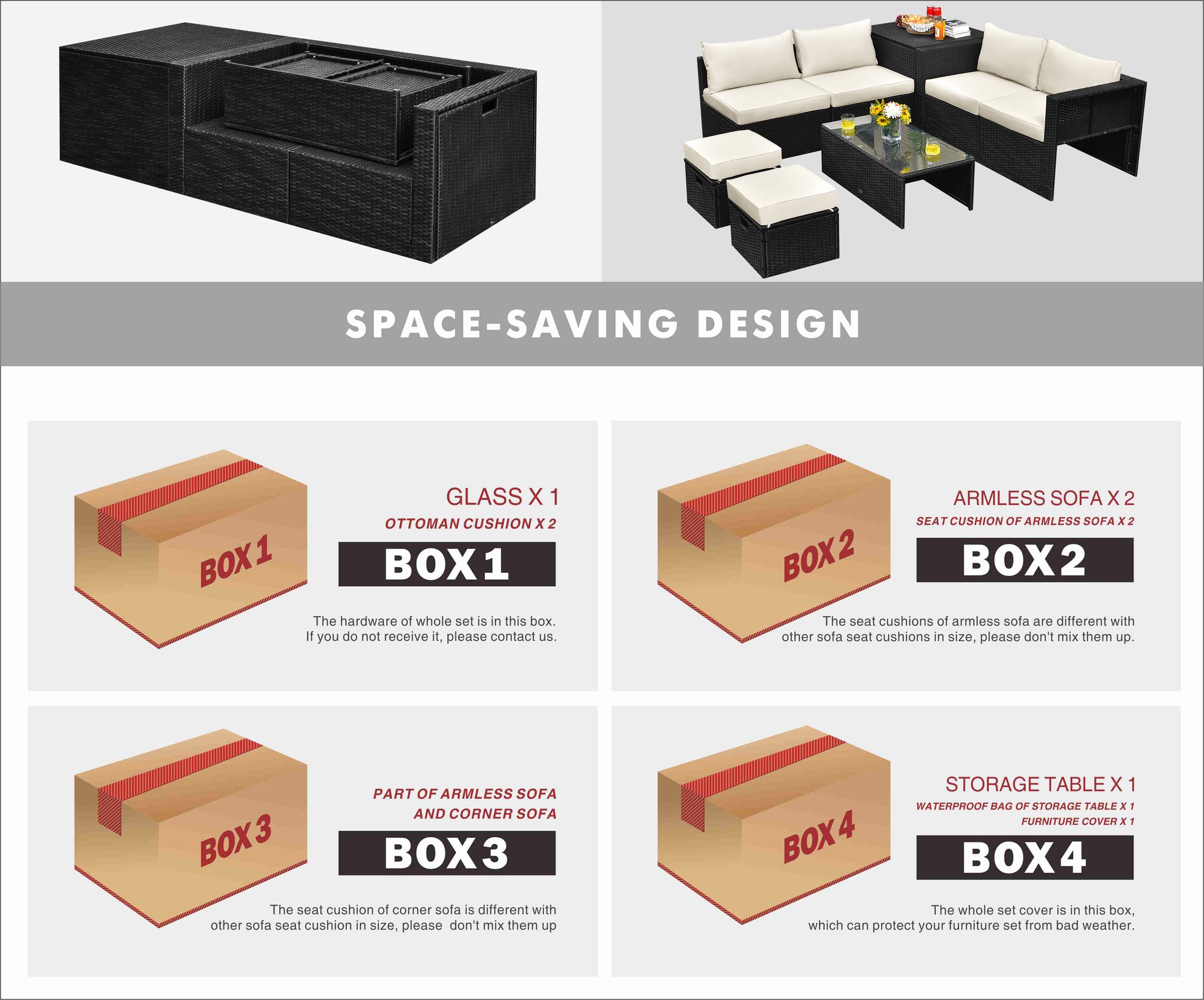 Product Information: The full set comes in 4 separate packages, which might not arrive on the same day. The overall dimension of the table:100cm x 50cm x 34cm (L x W x H), the overall dimension of the storage box: is 85cm x 75cm x 65cm (L x W x H), and the overall dimension of each ottoman: 44cm x 44cm x 40cm (L x W x H), the overall dimension of each corner sofa: 75cm x 75cm x 65cm (L x W x H), overall dimension of each armless sofa: 69cm x 71cm x 62.5cm (L x W x H).