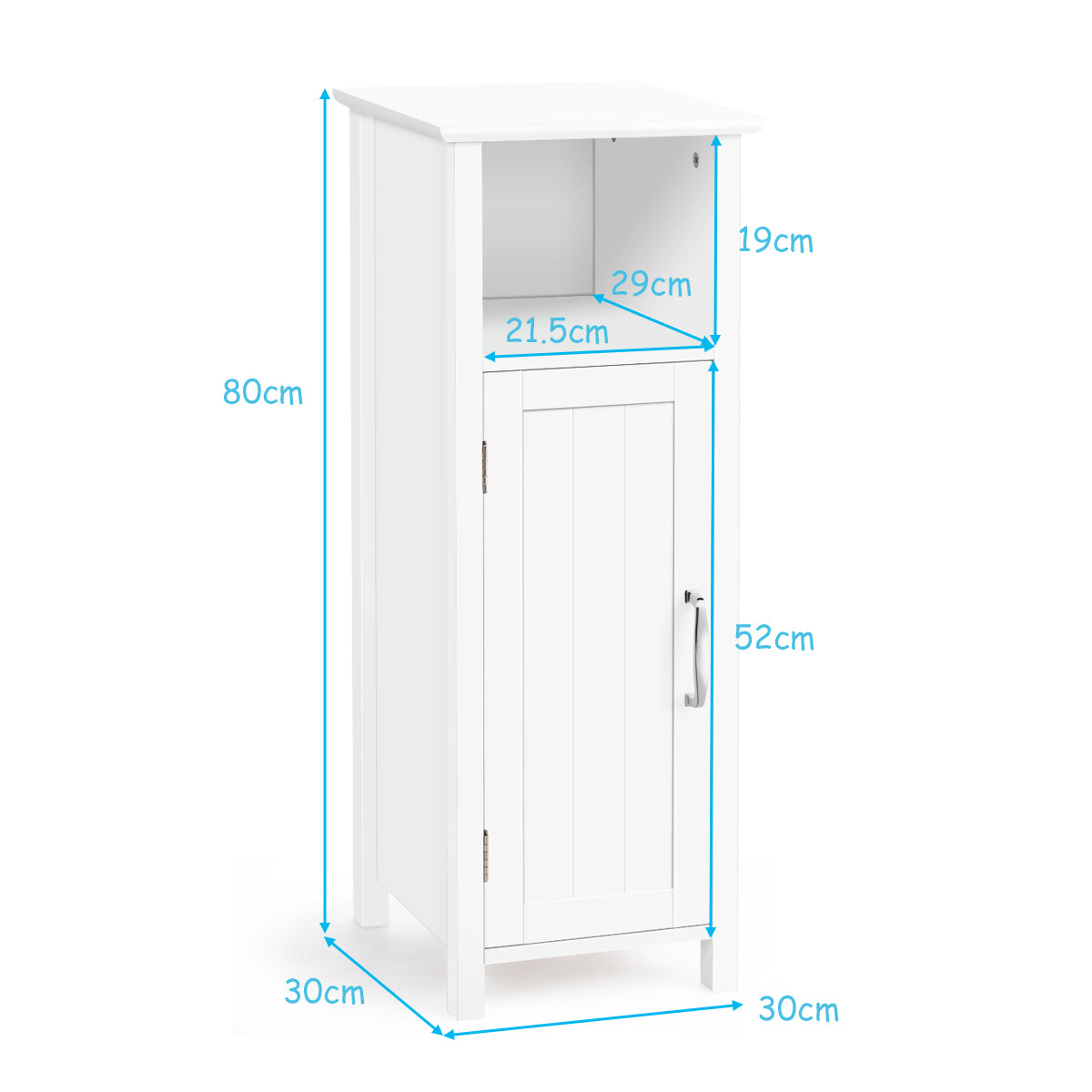 This is our simple and stylish storage cabinet. It is made of MDF, which is waterproof and durable. Premium material and rugged structure give you a perfect cabinet for durability and long life. A large storage space can help you better classify your items. The open top compartment of the cabinet can be used to hold some items for daily use, and your extra items can be placed behind the door. The storage cabinet has height-adjustable shelf to meet your storage needs for items of different heights. This elegant cabinet is an ideal solution for bathrooms, kitchens, living rooms and bedrooms. By the way, featuring anti-tipping devices, this cabinet is safe to use. Bullet Point: High Quality Frame Structure: This storage cabinet is made of environmentally friendly wooden board material with waterproof coating, so it is very suitable for humid environment such as bathrooms. The high quality materials make the overall structure very stable and will not be easily shaken. Besides, the anti-toppling fitting design provides you with a safe guarantee. Save Space Effectively: This storage cabinet occupies a very small area, which can expand the storage space of the home vertically. Moreover, this cabinet provides sufficient storage space while saving space. It is an ideal place to store books, towels, decorations and daily small items, making your room tidy. Adjustable Shelf: Adjustable shelf behind the cabinet door that can be adjusted to the right height for different items. Whether it's a large bottle of shower gel or shampoo, don't worry about the problem you can't put in. It gives you more choices for placing diverse items. Suitable for Many Occasions: The minimalist design is perfectly compatible with any room decoration style, adding an elegant charm to your room. This floor cabinet can be used not only as a storage space for bathrooms and kitchens, but also as a bedside table in the bedroom and a coffee table in the living room. Easy to Assemble and Detailed Explanation: The assembly of this storage cabinet is simple. We will provide all the accessories needed and detailed instructions for easy assembly. Simply follow the instructions and you can quickly assemble it. More, comes with smooth and flat surface this cabinet is also easy to clean Features: Rugged MDF structure ensures long time worry-free using Adjustable shelf behind the door is designed for different items Anti-tipping devices for safe using The large storage space keeps everything in order. High quality hardware materials are durable and not easy to rust. The metal handle is beautiful and practical. Magnetic suction door design, easy to open and close A good storage solution for bathroom, bedroom, living room, kitchen, Easy to assemble with detailed instructions Specifications: Color: White Material: MDF Net weight: 8.5KG Product dimensions: 30 x 30 x 80CM (L x W x H) Weight capacity of each tier: 30KG Package includes: 1 X Storage Cabinet 1 X Instructions Box Qty:1(May vary by batch)