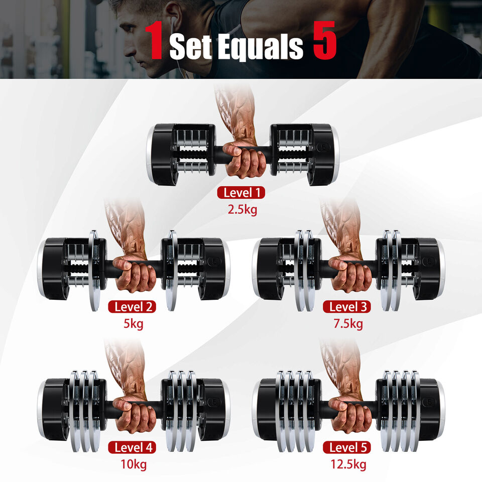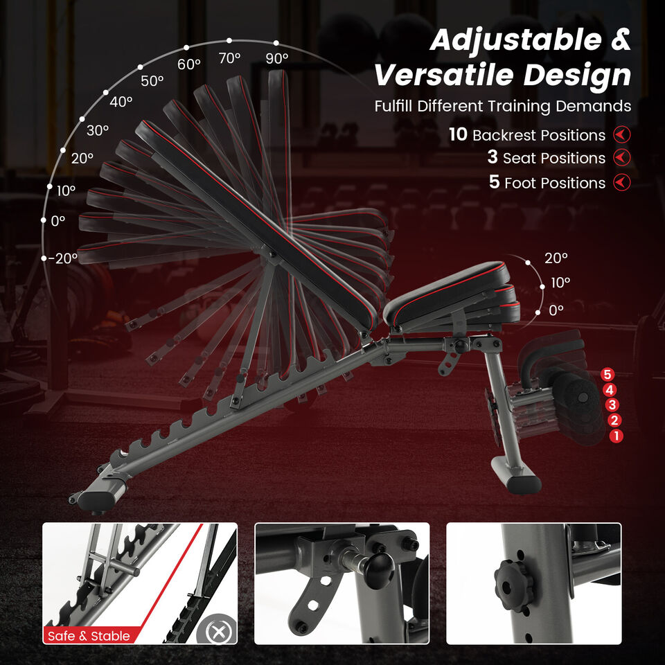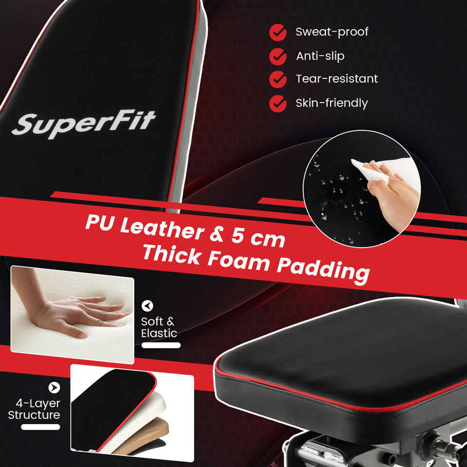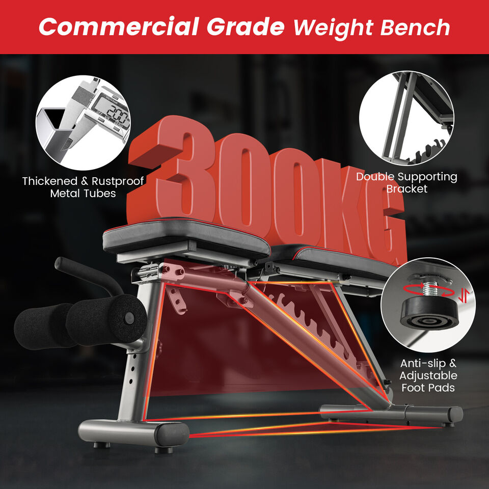 This adjustable weight bench is a good choice for you to do exercises at home! Equipped with 10 back positions, 3 seat positions and 3 foot positions, this adjustable workout bench can meet all your exercise needs. For use with 12.5 kg adjustable dumbbells, you can use it to do a dumbbell biceps curl, dumbbell row, dumbbell fly, bench press, sit up and more to strengthen your body. Besides, the rugged metal tube frame and thick foam padding with a 4-layer structure aim to give you a comfy, safe & stable workout. This commercial-grade weight bench can support up to 300 kg. The sweat-proof and anti-tear PU leather ensures a long service life. Moreover, the built-in handle and flexible wheels allow you to move the bench to any place conveniently. Bullet Point: Adjustable & Versatile Design: To fulfil different training demands, this weight bench comes with 10 backrest positions, 3 seat positions and 5-foot positions. You can use the bench to do a variety of workouts, such as dumbbell bicep curl, dumbbell fly, barbell bench press, sit-ups, push-ups, leg and abs exercises, etc. Commercial Grade Weight Bench: Thickened & rustproof metal tubes and anti-slip & adjustable foot pads make the workout bench strong enough to load up to 660 lbs/ 300 kg and won't wobble easily. Plus, the back double supporting bracket offers steadier support to the backrest. Comfy Cushion & Durable Leather: The wide seat and long backrest are both filled with 5 cm thick, soft & elastic foam padding to provide you with great comfort. Besides, the premium PU leather is sweat-proof, anti-slip, tear-resistant skin-friendly and easy to wipe clean. Designed for Full Body Workout: With this adjustable weight bench, you can perform various workouts to train whole body muscles, including chest, abdomen, hip, arms, legs, etc. In addition, this commercial-grade fitness bench is ideal for not only the home but also the office, gym and more. Safe & Convenient Design: The leg holding bar with thick high-density foam pads can protect your legs from injury. What's more, equipped with a built-in handle and 2 smooth rolling wheels, this home gym exercise bench is easy to move from room to room. Features: The combination of a dumbbell bench and dumbbell provides the same exercise effect as the home gym 10 back positions, 3 seat positions, 5 foot positions for diversified workouts Thick foam padded seat cushion and backrest provide ultimate comfort Sweat-proof, tear-resistant and anti-scratch PU leather prolongs the service life Heavy-duty metal construction improves stability and ensures safety Anti-slip & adjustable foot pads offer added stability and floor protection A portable handle and 2 wheels make it easy to move around Dual backrest supporting tubes evenly distribute pressure 2-roller leg developer with thick foam offers high security Perfect workout bench to exercise whole body muscles Suitable for various places: home, gym, office, etc Specifications: Colour: Black Weight Bench: Material: Metal, PU, EPE Foam, Sponge Product Dimension: 150 cm x 51.5 cm x 53-132 cm (L x W x H) Seat Cushion Size: 36 cm x 31 cm x 5 cm (L x W x Thickness) Back Cushion Size: 88 cm x 31 cm x 5 cm (L x W x Thickness) Adjustable Height of Leg Holding Bar: 24-27-30-33-36 cm Net Weight: 19.5 kg Weight Capacity: 300 kg Dumbbell: Material: Steel + PP + PA6 Overall Dimension: 37 cm x 19 cm x 16 cm (L x W x H) Net Weight: 13 kg Weight Adjustment Range: 2.5/5/7.5/10/12.5 kg Grip Weight: 2 kg Package Includes: 1 x Adjustable Weight Bench 1 x User Manual 1 x Dumbbell 1 x Instruction Box Qty:1(May vary by batch)