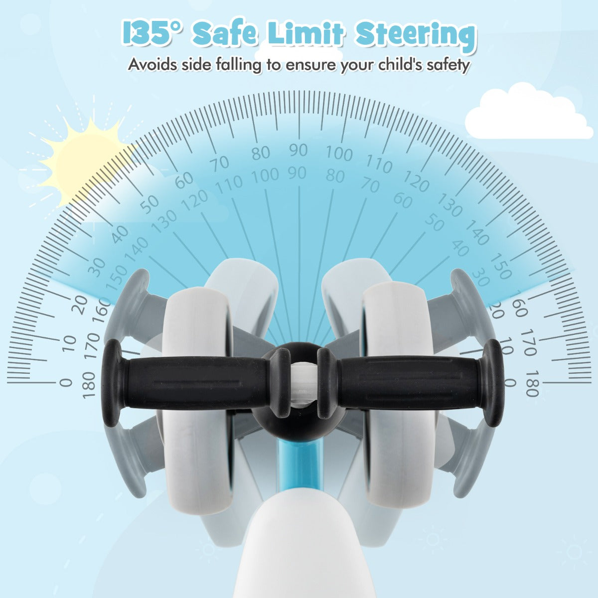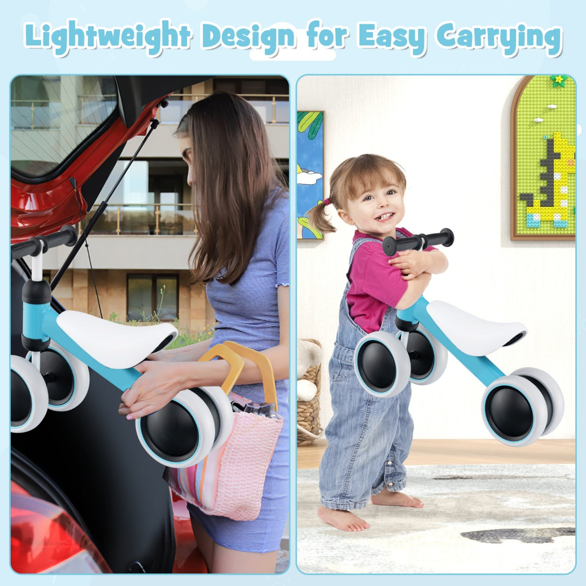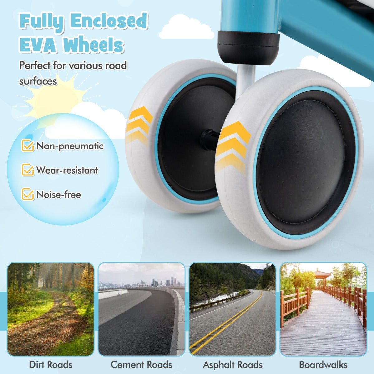 Experience the ultimate riding adventure with our toddler balance bike! Designed with safety in mind, the 135° safe limit steering feature prevents side falls, allowing your child to ride confidently. The padded seat and non-slip handlebar provide optimal comfort for hours of play. The rust-resistant metal frame and four-wheel design ensure stability on any surface. Give the gift of fun and development with this balance bike! Help your child strengthen their legs, improve balance, and boost self-confidence while having a blast. Bullet Point: Secure and Fun Steering: Our toddler balance bike is engineered with a 135° safe limit steering feature, meticulously designed to avoid the risk of side falls, ensuring your child's safety while they learn and have fun. This careful consideration makes the bike suitable for young riders to build self-confidence securely. Comfort on Every Ride: The ergonomically shaped padded saddle seat on this toddler bike offers optimal comfort, tailored to support your child during extended playtimes. Together with a soft TPE-covered handlebar that prevents slipping, these kid-friendly details ensure a joyful and comfortable riding experience. Lightweight Yet Robust Build: This balance bike weighs only 1.6 kg, making it easy to control and carry around. Children can explore their environment with less parental intervention, boosting their confidence and independence. Additionally, the rust-resistant metal frame and four-wheel structure enhance overall structural stability. Our balance bike is AS/NZS ISO 8124 certified for safer use. Fully Enclosed EVA Wheels: This toddler ride-on toy is equipped with fully enclosed EVA wheels that are non-pneumatic, wear-resistant, and noise-free, making them perfect for various road surfaces including dirt roads, cement roads, asphalt roads, boardwalks and more. Kids can enjoy their rides without the worry of frequent maintenance. Ideal Gift for Active Toddlers: This baby balance bike helps kids enhance leg strength, improve balance and build self-confidence, while allowing them to enjoy riding fun. It's a perfect present to celebrate milestones in a child’s life, making it a cherished addition to any young one’s playtime essentials. Specifications: Color: Blue/Orange/Pink Material: Metal, TPE, EVA, PVC, Sponge Overall Dimensions: 47 x 22 x 37 cm (L x W x H) Seat Height: 22 cm Recommended Inseam: 23-33 cm Net Weight: 1.6 kg Weight Capacity: 20 kg Recommended Age: 2+ Years Old Package Includes: 1 x Baby Balance Bike 1 x Instruction Manual Box Qty:1(May vary by batch)
