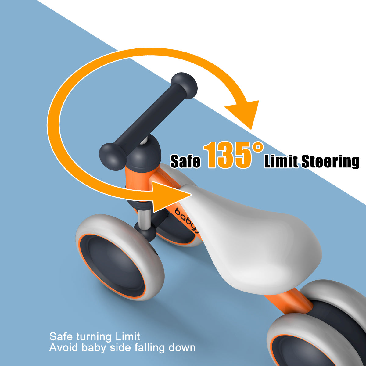 Baby-Friendly Design: The rounded frame, a cushy ergonomic seat and the soft non-slip hand grips, all designed to provided nothing but a comfortable and safe riding for kids. The no-pedals design, fully enclosed wheels avoid clamping baby's feet. And a 135-degree steering limited to avoid baby from side falling down.