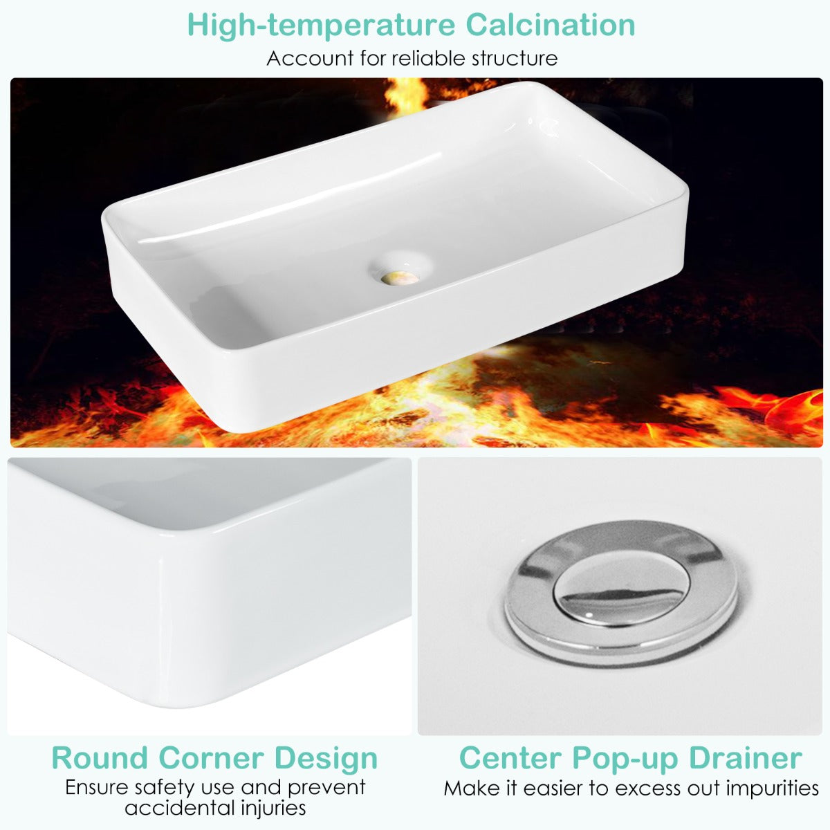 Pop-up Drain: This ceramic basin is equipped with a pop-up drain, providing optimal draining capability. It can effectively filter the impurities hair on the bouncer and clean it up at any time to prevent impurities from entering the lower water pipe and blocking, which is convenient for you to organize.