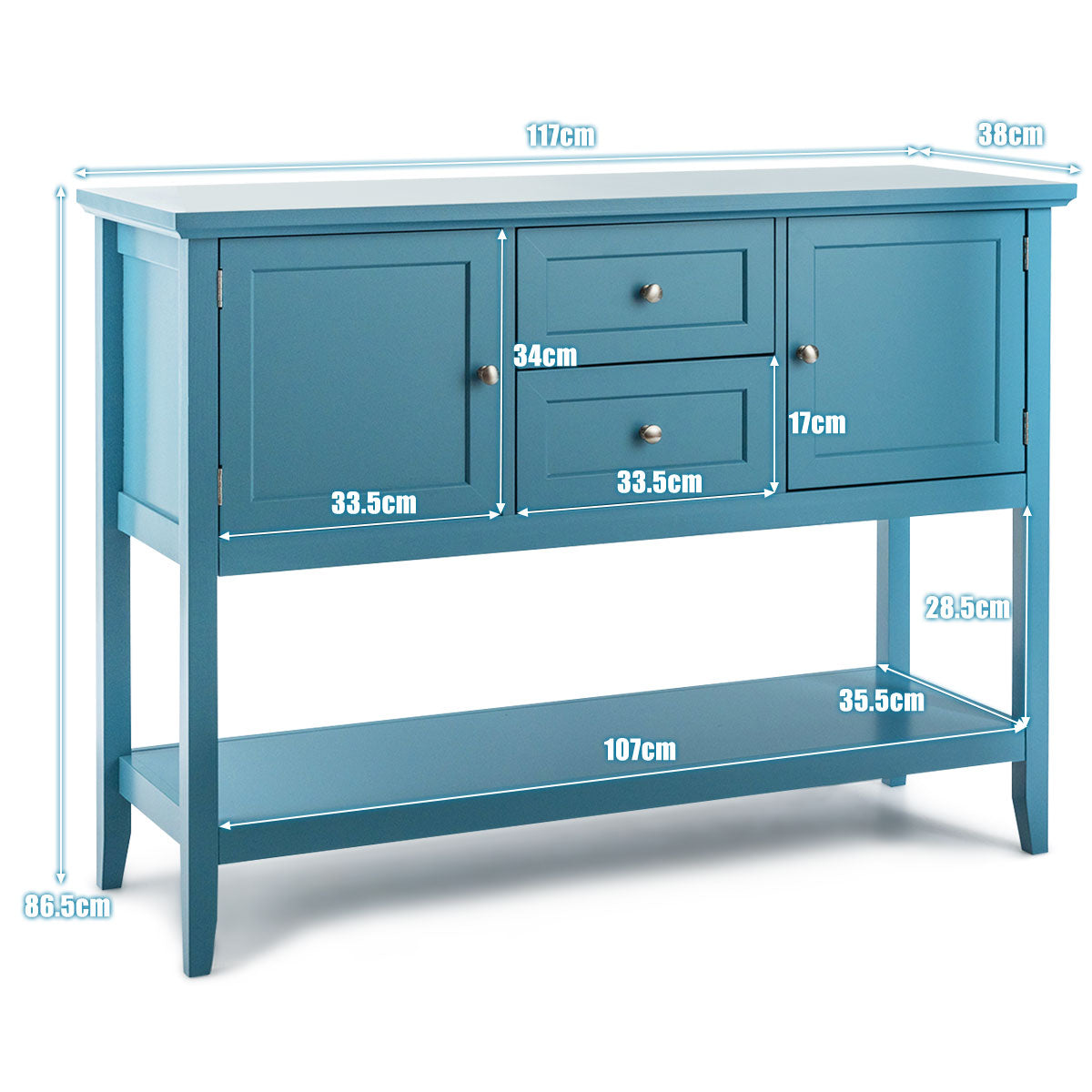 Are you still looking for a practical sofa table with high attractiveness? Our buffet sideboard will be the perfect choice. Polished surface and elegant style show an eye-catching looking, which is ideal for decorating all occasions. 2 cabinets and 2 drawers provides ample storage space with safe protection. Also, the spacious tabletop and bottom rack help to display collections in a better way. This narrow console table allows you to organized items orderly while saving space. Made of premium MDF and solid wood, this sofa table ensures high stability, durability and sturdiness. The table can load up to 70kg without wobbling. In a word, this modern buffet sideboard is a necessary addition to home, office and café store. Bullet Point: Elegant & Versatile Console Sofa Table: This narrow console table can be placed in the entryway for storage and decoration. Thanks to its elegant wooden appearance, this buffet sideboard cabinet can be perfectly matched with various décor styles, adding charming appeal to your room. Ample Storage Space for Better Displaying: 2 drawers and 2 cabinets provides you with ample space to store items in partition. The spacious tabletop and bottom large rack allow you to display collections in an outstanding place and store handy things for easy access. Durable Material & Sturdy Construction: Adopted premium MDF, this buffet sideboard ensures high durability and wear resistance. Thanks to the solid wood legs and sturdy construction, this 2 doors cupboard can be supported stably and load up 70kg. Wide Application in All Occasions: This stylish sideboard cabinet ensures attractiveness and practicality. You can treat it as a sideboard, a console table, an entry table and a buffet table. Also, the table can be used in different occasions, such as office, café store and restaurant. Quick Set-up & Easy Cleaning: Since all parts and accessories are given in the package, this console table can be put together quickly following the detailed instruction. In addition, the waterproof surface with smooth design can be cleaned easily with a damp cloth. Features: 2 drawers and 2 cabinets store items orderly & protectively Spacious tabletop & bottom rack for better storing & displaying Narrow design with ample storage space for space saving 70 kg maximum load capacity without wobbling Durable material & sturdy construction for long-term use Eye-catching home decoration fits home, office, café store Easy assembly and daily cleaning save time & energy Specifications: Colour: Blue/Coffee/Grey/White Material: MDF, pine wood Product dimensions: 117 x 38 x 86.5 cm (L x W x H) Net weight: 28kg Weight capacity of desktop: 40kg Weight capacity of drawer: 5kg Weight capacity of bottom shelf: 20kg Package Includes: 1 x Buffet sideboard with drawer 1 x Instruction Box Qty:1(May vary by batch)