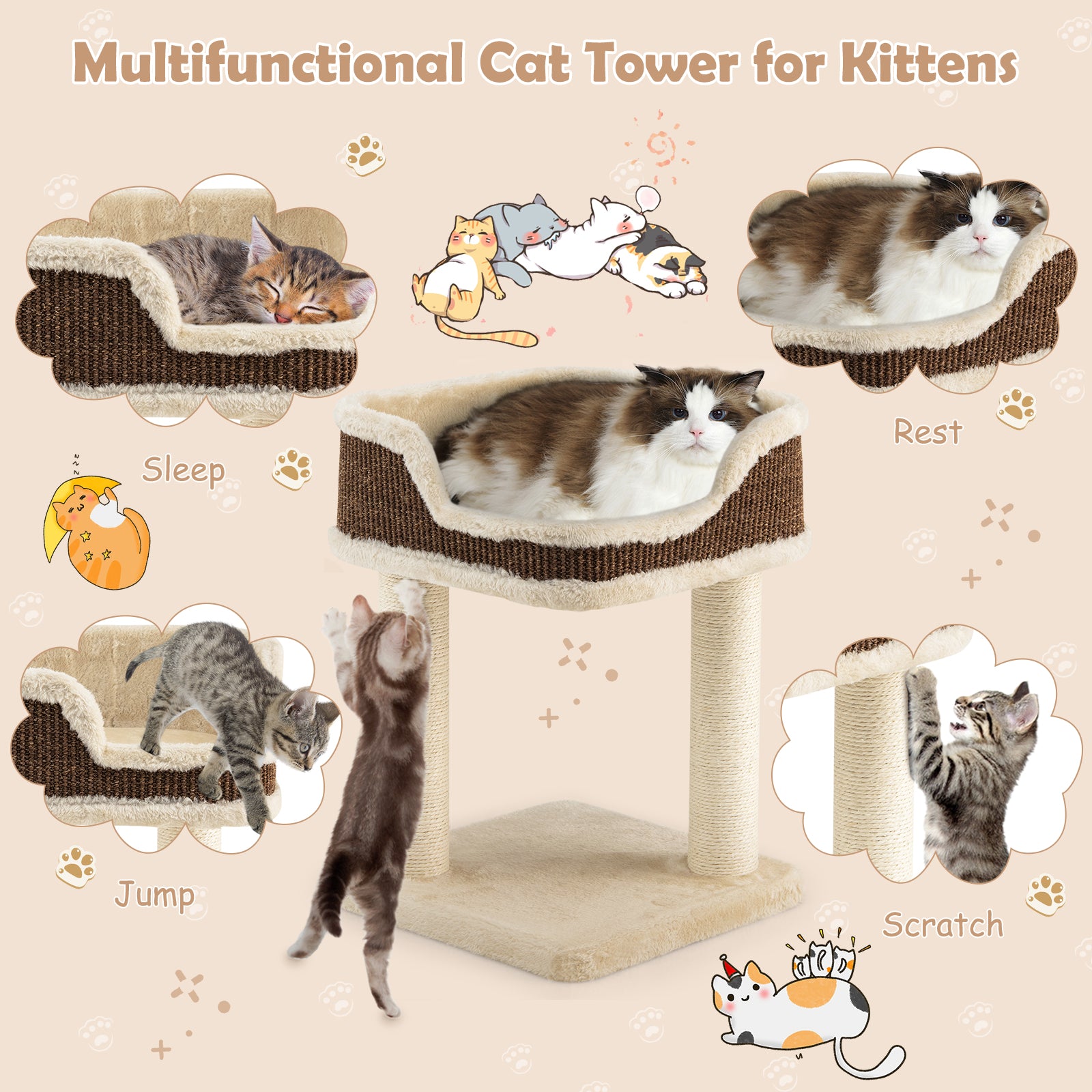 NNECW Compact Cat Tree Tower for Scratching Relaxing & Sleeping-Beige