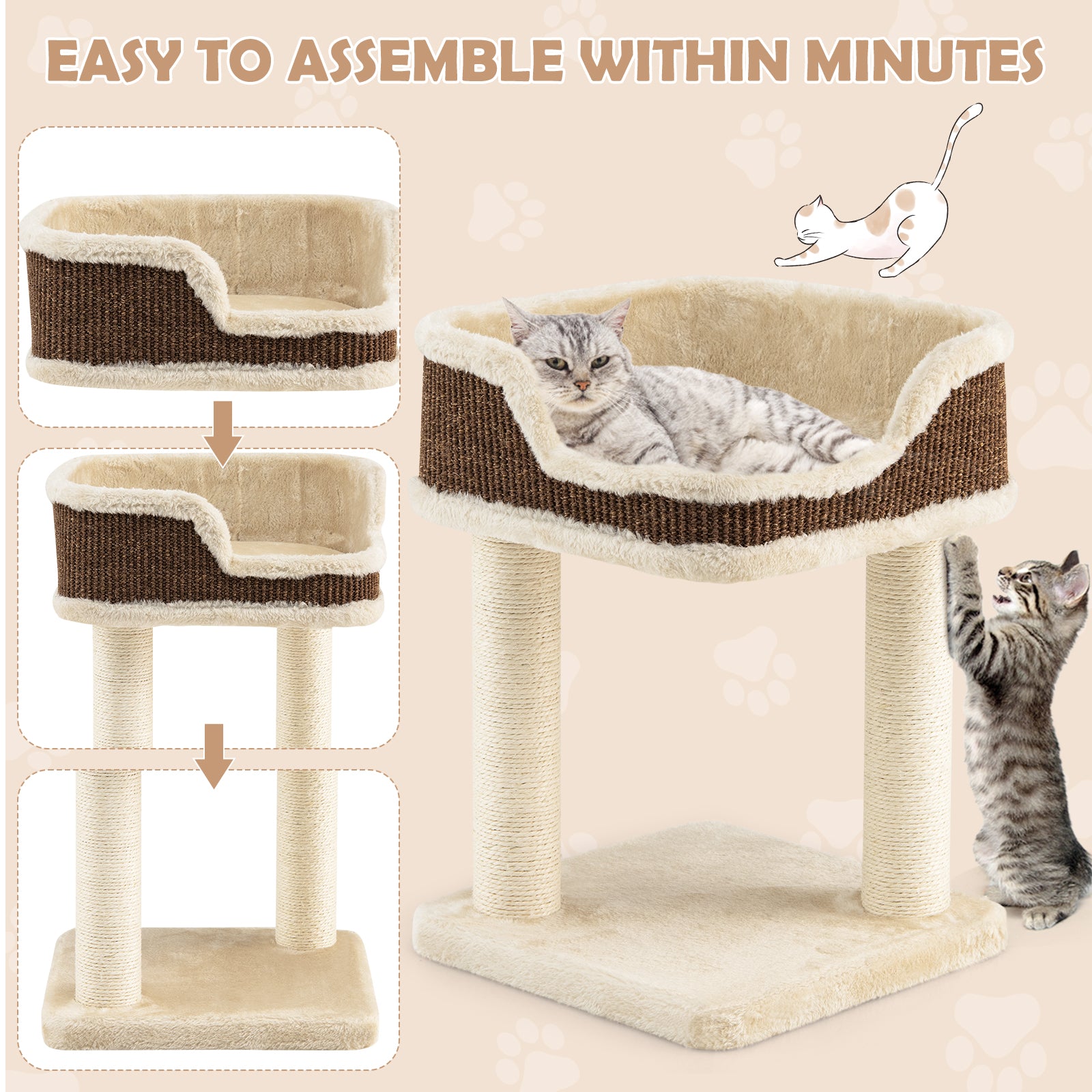 Practical Sisal Posts: This cat climbing tree comes with two sisal posts. Sisal is a bark-like texture suitable for cats to scratch and climbs to release their instincts and keep their claws healthy. It is also a solution that will save your sofa, or bed sheet from being damaged by your cat's sharp claws.