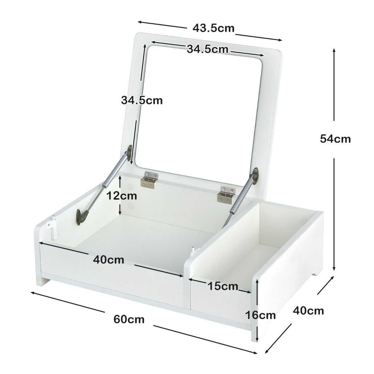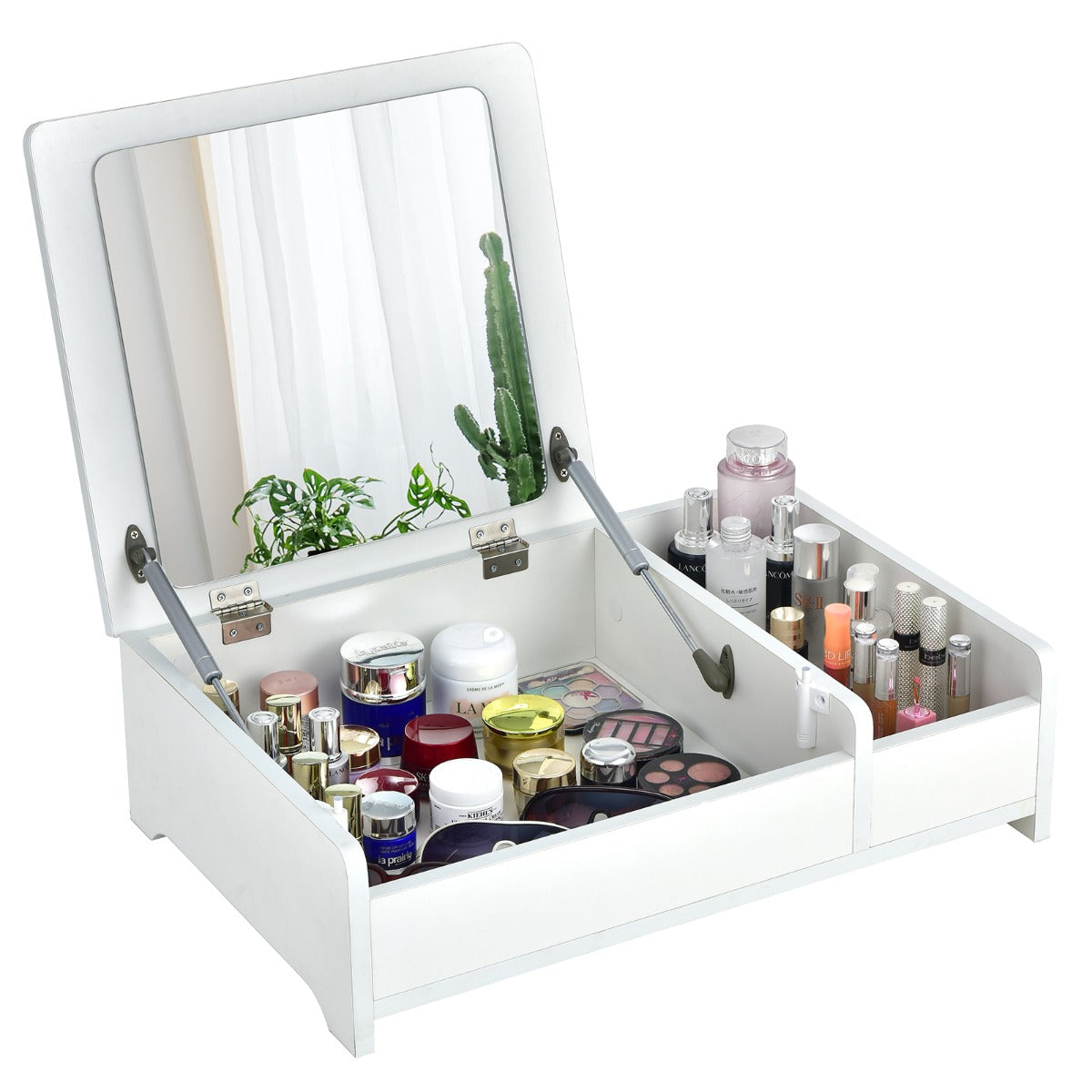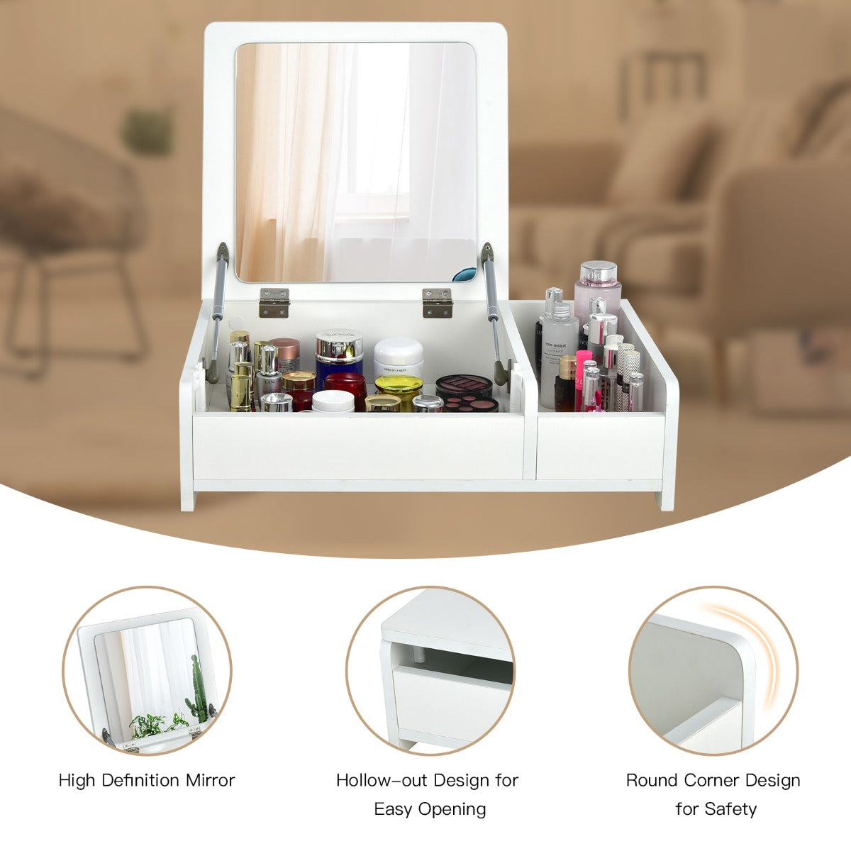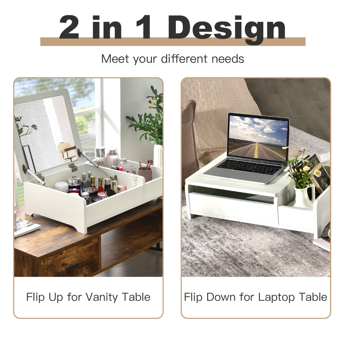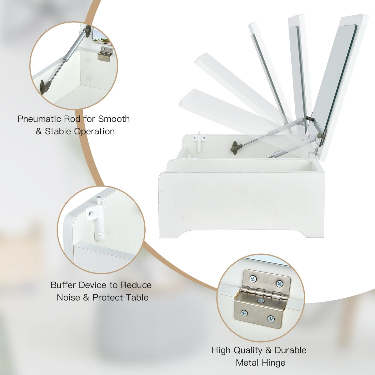 Flip Top Mirror for Dual Use: Featuring a flip-top design, the mirror of this countertop vanity table is easy to flip up and down for your daily makeup. And you can put down the mirror to use it as a laptop desk conveniently. The heavy-duty pneumatic rods and anti-bumping devices ensure smooth and silent operation.