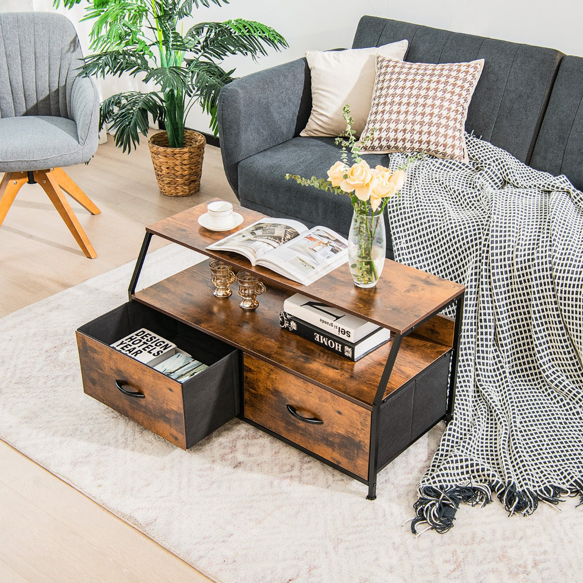 Say goodbye to messy rooms! The 2-drawer dresser will help you classify the sundries and give you a more organized living space. It consists of 2 open shelves and 2 pull-out fabric drawers, offering ample storage space for books, clothes, CDs, ornaments and more. What's more, the rustic wood grain and matte black frame form an industrial style that blends into different decorations. Thus, you can use the chest of drawers in your bedroom, living room, nursery and entryway. In addition, the storage cabinet is well constructed from durable MDF and powder-coated steel, to keep excellent sturdiness and durability. And there are adjustable foot pads and anti-toppling devices to add extra stability.