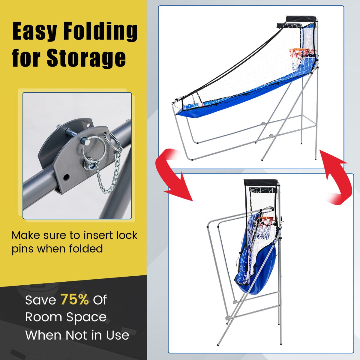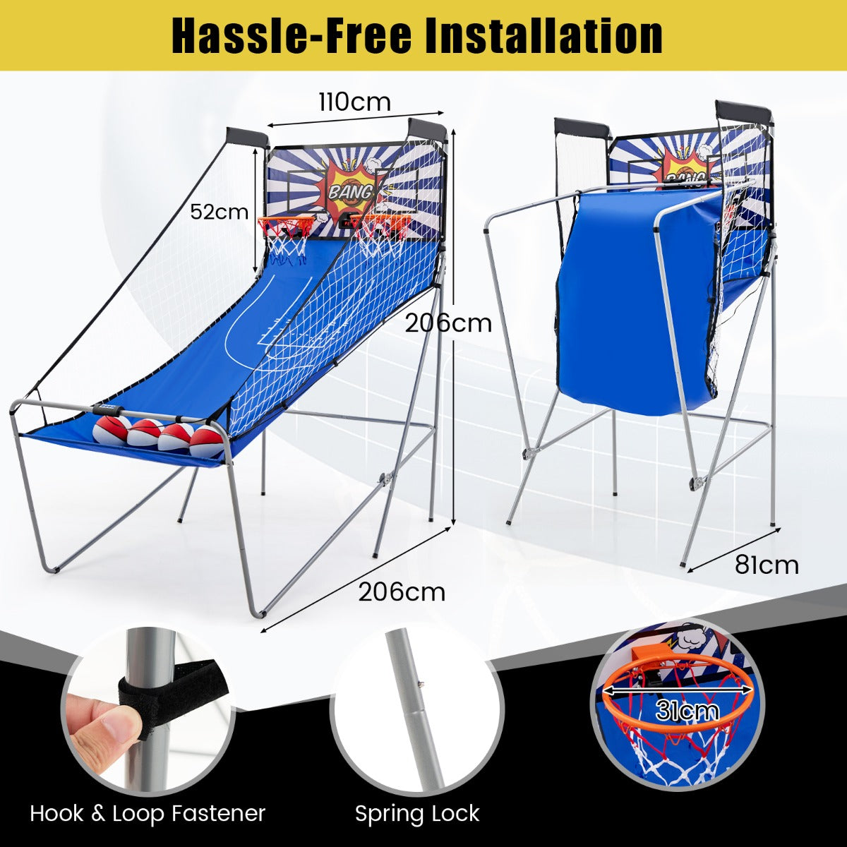 Take your basketball game to the next level with the folding dual-shot arcade basketball game. This basketball game machine features 8 exciting game modes and is suitable for 1-4 players to have fun together, allowing you to compete against friends and family. The metal frame is built to last, and the sturdy backboard with a metal rim is durable for intense play. With its convenient folding design, this basketball arcade game is easy to set up and store. Get ready for endless hours of fun and competition. Bullet Point: Dual Shot Basketball Game: This basketball arcade game allows you to enjoy the game with friends and family or practice your shooting technique, suitable for kids and adults. Accessories included: 4 rubber basketballs and 1 inflation pump. 8 Exciting Game Modes: This arcade game offers 8 exciting game modes for 1-4 players to provide them hours of fun: beat the time clock, 3-point beat the time clock, battle back, horse, checkpoint, around the world, left and right shoot and one to one. Easy Folding & Hassle-Free Installation: Designed for convenience, this basketball arcade game can be easily folded and stored away when not in use (make sure to insert lock pins when folded), perfect for small spaces. Hook and loop fasteners and spring locks save you time and effort when assembling. Control Panel & Electronic Scoring: You can keep track of your scores with the bright and clear electronic scoring display, which provides accurate and real-time scoring. Note: require 3 AA batteries (not included). The control panel is easy to use and changes the game mode. Stable & Durable Construction: Built to withstand intense play, this arcade game is made with a shatterproof MDF backboard with a sturdy 31 cm metal rim and thick net. The rustproof powder-coated metal frame and non-slip foot pads guarantee stability. The blocking net on both sides saves your effort collecting the ball, so you can focus on your game. Features: Available in 8 different game modes Easy to control through the control panel Made with anti-tear and smooth ball return ramp Equipped with a strong blocking net on both sides Includes 4 basketballs with easy-to-grip surface texture Inflates the basketball easily and quickly with the included pump Quick to fold for space-saving storage Built with a sturdy MDF backboard and heavy-duty metal rim Offers hours of fun for kids and adults Simple to assemble with detailed instructions Specifications: Colour: Blue/White+Blue/Red+Blue Material: Metal + MDF + Polyester Assembled Dimension: 206 cm x 110 cm x 206 cm (L x W x H) Folded Dimension: 110 cm x 81 cm x 206 cm (L x W x H) Backboard Dimension: 110 cm x 52 cm (L x W) Rim Diameter: 31 cm (outer), 29 cm (inner) Basketball Diameter: 17 cm Battery Requirement: 3 AA batteries (not included) Net Weight: 15 kg Package includes: 1 x Basketball Arcade Game 4 x Basketballs 1 x Inflation Pump 1 x User Guide Box Qty:1(May vary by batch)